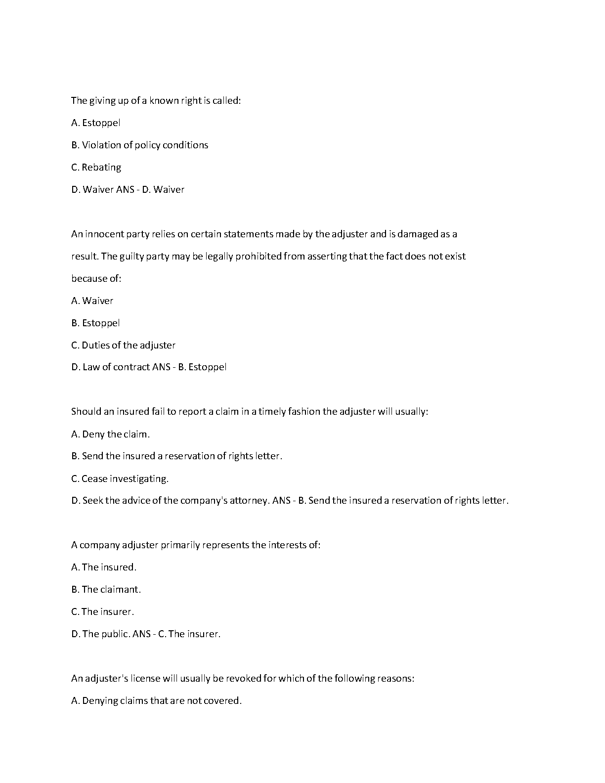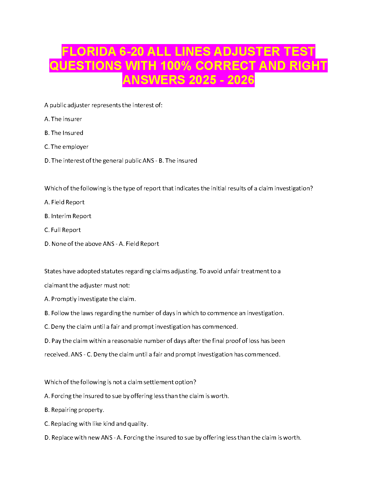 Ace your Florida 6-20 All Lines Adjuster exam on the first try with our expertly crafted 2025-2026 test bank. This comprehensive study guide features a wide range of exam-style questions, each paired with a 100% correct and verified answer. Designed to cover all essential topics, this resource is your ultimate tool to build confidence, master the material, and successfully obtain your Florida adjuster license without the stress of resits. Get immediate access to the questions and answers that will help you pass your exam!