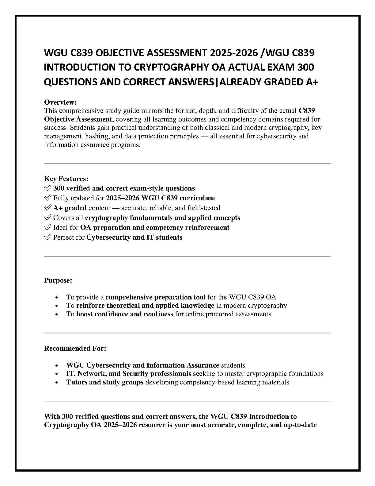 Ace your WGU C839 Introduction to Cryptography Objective Assessment on the first try with our expertly crafted test bank for the 2025-2026 academic year. This A+ graded resource is designed to mirror the actual exam, featuring 300 verified questions and detailed answers. Master key concepts including classical and modern cryptography, hashing, and data protection principles. This comprehensive study guide is your ultimate tool to build confidence, reinforce knowledge, and pass your OA successfully, avoiding any resits.