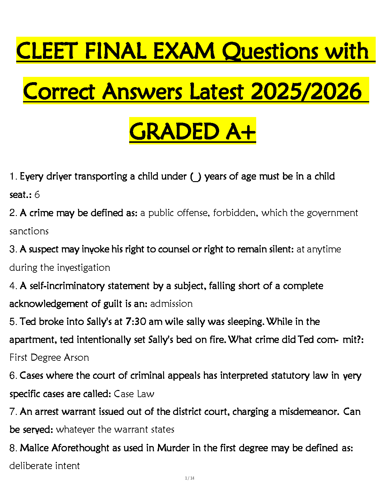 Prepare to excel in your Council on Law Enforcement Education and Training (CLEET) final exam with this comprehensive test bank for the 2025/2026 academic year. This resource is packed with the latest exam questions and meticulously verified answers, all designed to guarantee you an A+ grade. Covering essential topics such as criminal law, arrest procedures, and legal definitions, this study guide is your ultimate tool for passing on your first attempt. Master the material, build confidence, and ace your CLEET certification with ease.