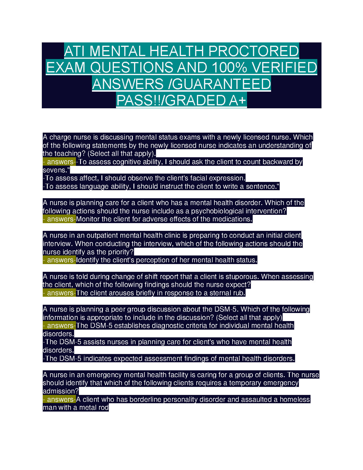 ATI Mental Health Proctored Exam 2024 Test Bank - 100% Verified Questions & Answers (Based on RN Mental Health Nursing, 12th Edition by Assessment Technologies Institute) - Graded A+ Guaranteed