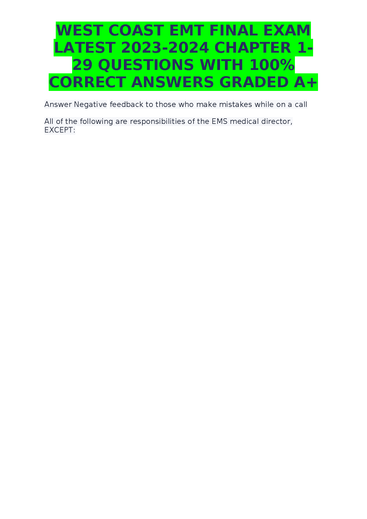 West Coast EMT Final Exam (Chapters 1-29) Latest 2023-2024 Edition | Verified Questions and Answers for an A+ Grade