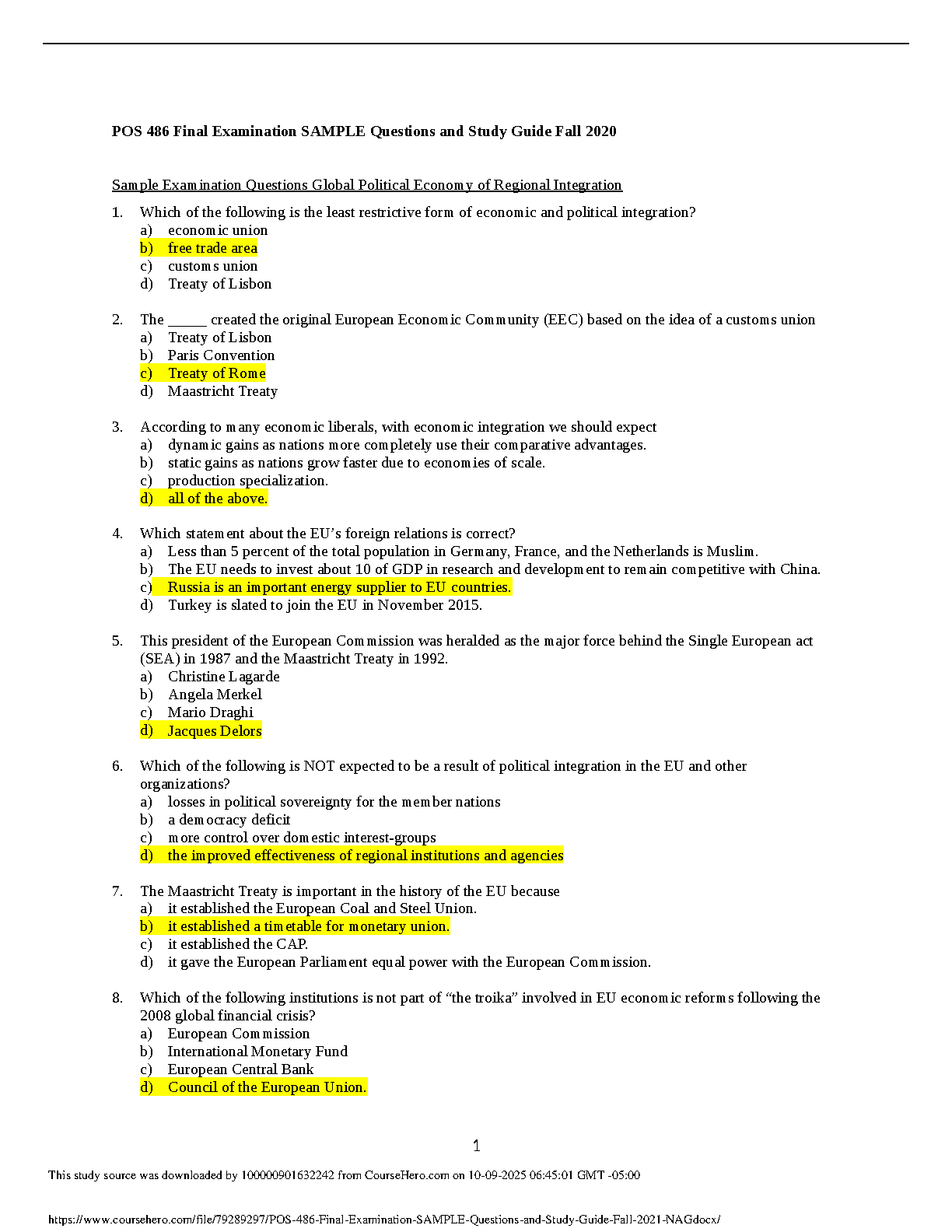 Unlock success in your POS 486 Final Exam with this comprehensive study guide for the 2025/2026 academic year. This guide provides a curated set of sample questions and verified answers focused on the Global Political Economy of Regional Integration. Master key concepts including the formation of the European Union, economic integration theories, the Maastricht Treaty, and the roles of major political institutions. This essential resource is designed to help you prepare effectively, ace your final exam on the first attempt, and avoid costly resits. Download now for a strategic advantage in your studies.