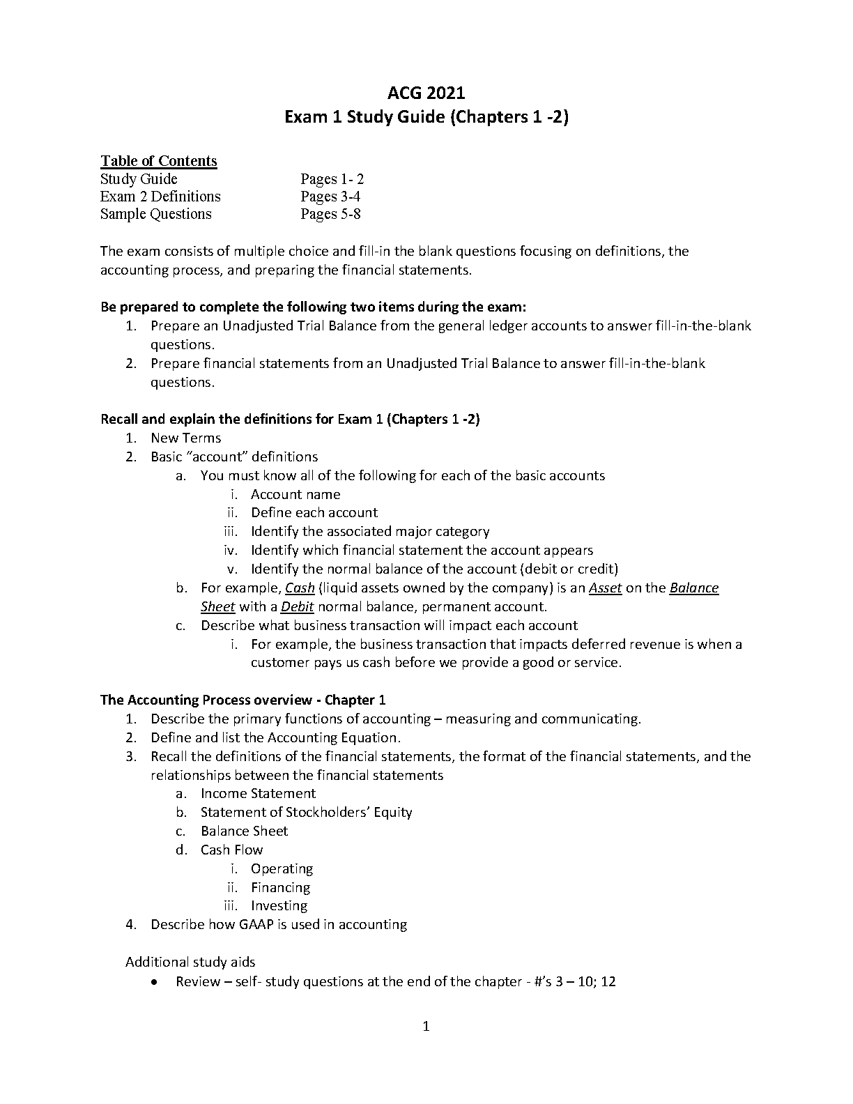 ACG 2021 Financial Accounting Exam 1 Study Guide (Chapters 1-2) for Weygandt, Kimmel, and Kieso, 11th Edition | 2025/2026 Guide to Pass First Try