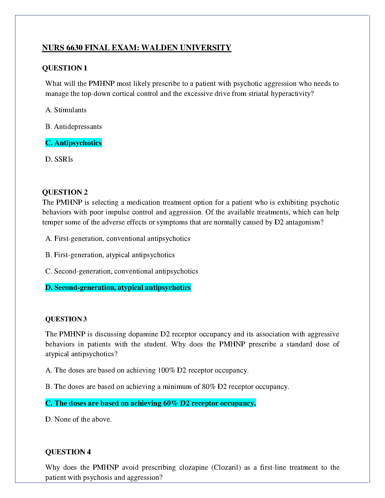 Ace your Walden University NURS 6630 Final Exam with our newly updated 2025/2026 study guide. This comprehensive resource features detailed exam elaborations, including a full set of questions with in-depth answers, specifically tailored for the 'Psychopharmacological Approaches to Treatment of Psychopathology' course. Stop worrying about resits and start studying smarter. This guide is designed to provide you with the knowledge and confidence needed to pass on your first attempt and achieve an A+ grade.