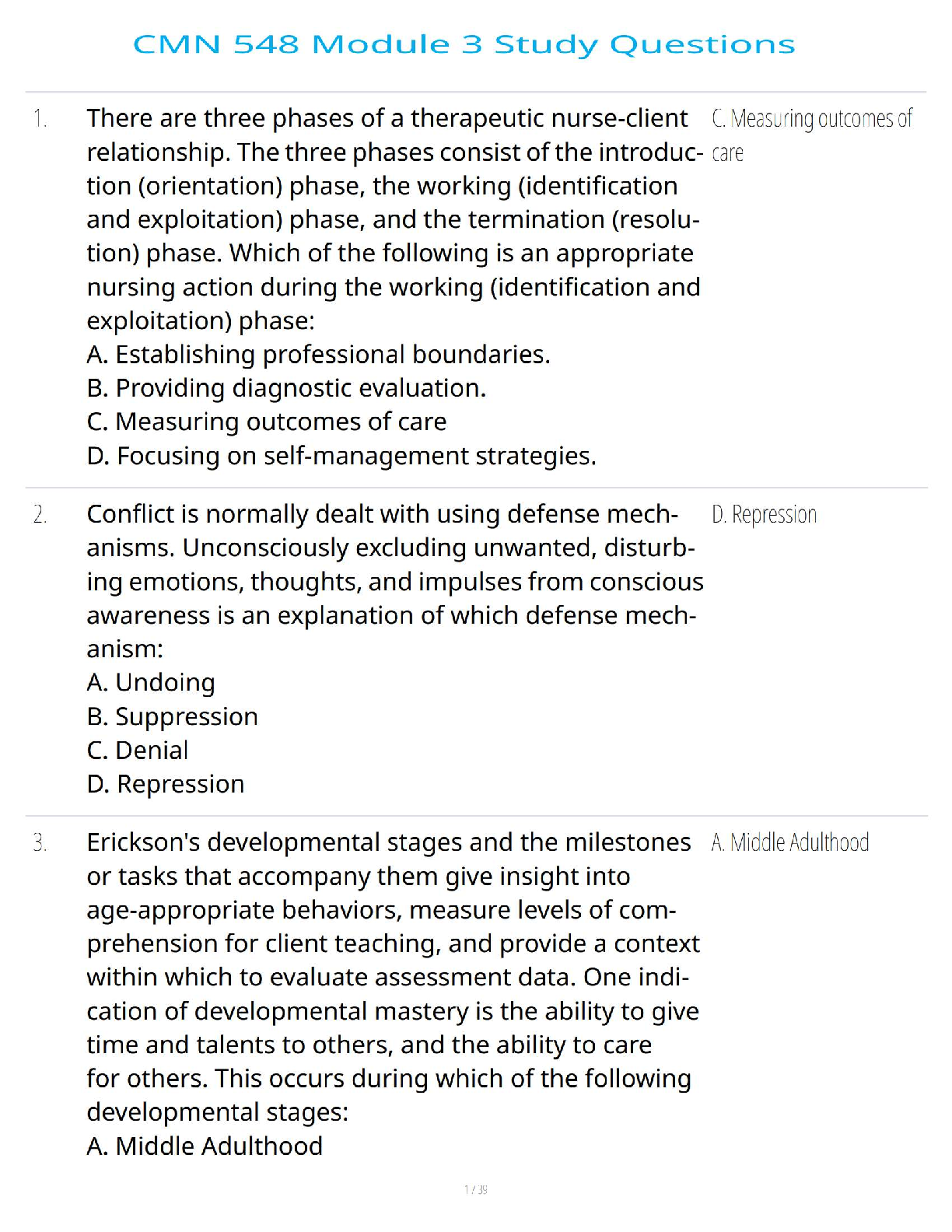 Unlock success in your Advanced Psychiatric Nursing course with our comprehensive Test Bank for CMN 548 Module 3. This updated 2025/2026 resource is packed with a wide range of study questions and meticulously verified answers. Master crucial topics including the therapeutic nurse-client relationship, psychological defense mechanisms, and Erikson's stages of development. This study guide is expertly crafted to help you grasp key concepts, build confidence, and pass your exams on the first attempt, eliminating the need for costly resits. Ideal for students aiming for top grades in their nursing program.