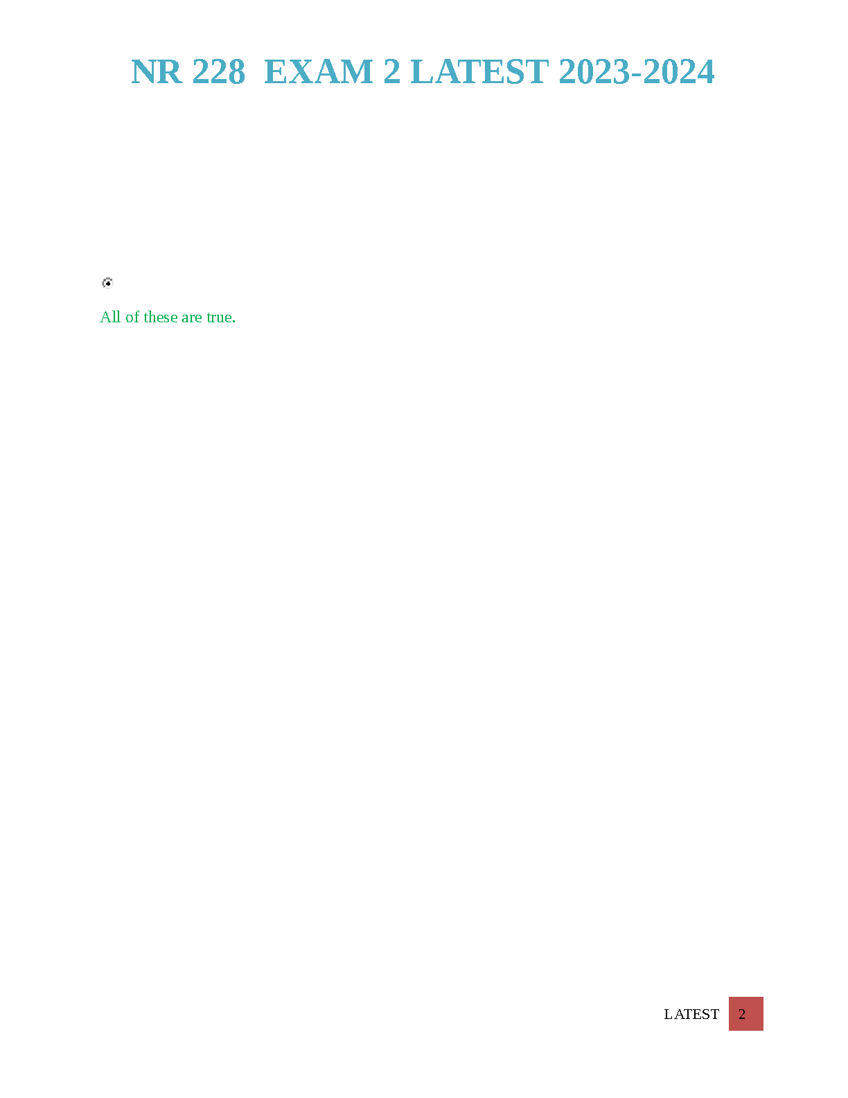Get ready to ace your Nutrition exam with the most up-to-date Test Bank for NUR 228 / SCI 228 Final Exam 2. This comprehensive resource, updated for the 2025/2026 academic year, features a complete set of real exam questions and 100% correct, verified answers. Each question is designed to mirror the actual exam format, covering all essential topics to guarantee you achieve an A+ grade. Stop worrying about resits and secure your success on the first attempt. Download this essential study guide now and master the NR 228 curriculum with confidence.
