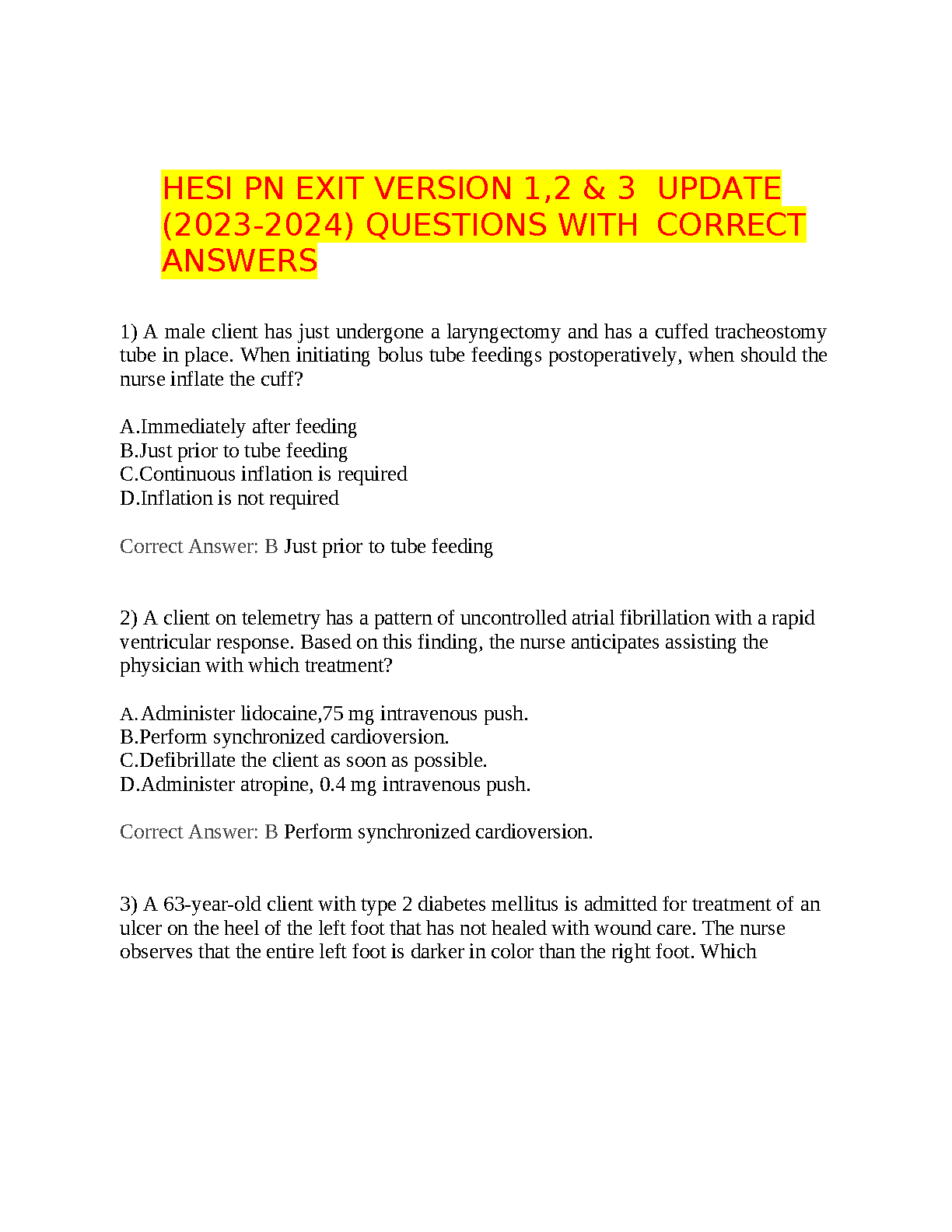 HESI PN Exit Exam 2024 Test Bank (Versions 1, 2, & 3) | Comprehensive Questions and Verified Answers