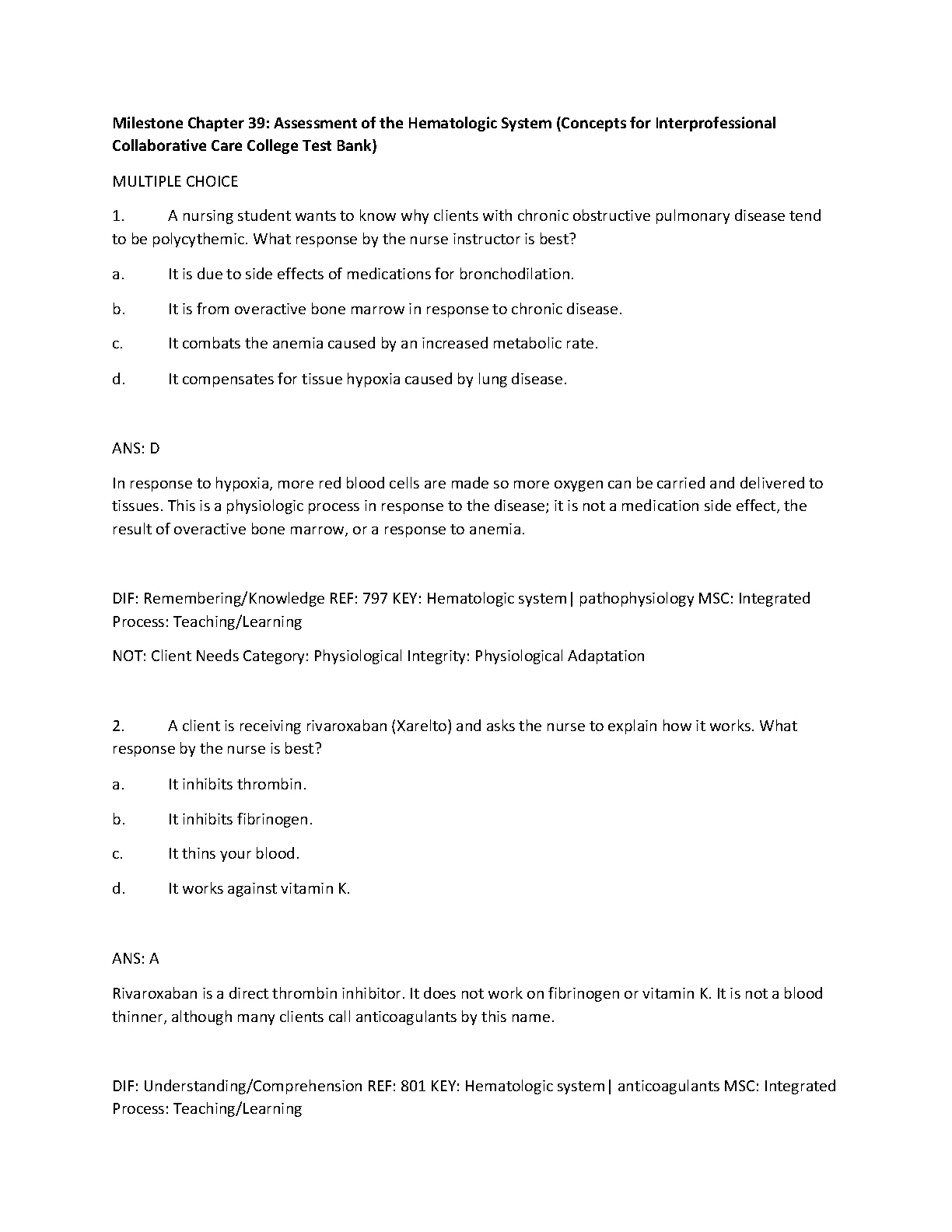 Milestone Chapter 39: Assessment of the Hematologic System (Concepts for Interprofessional Collaborative Care College Test Bank). DOWNLOAD on www.hackedexams.com INSTANTLY.
