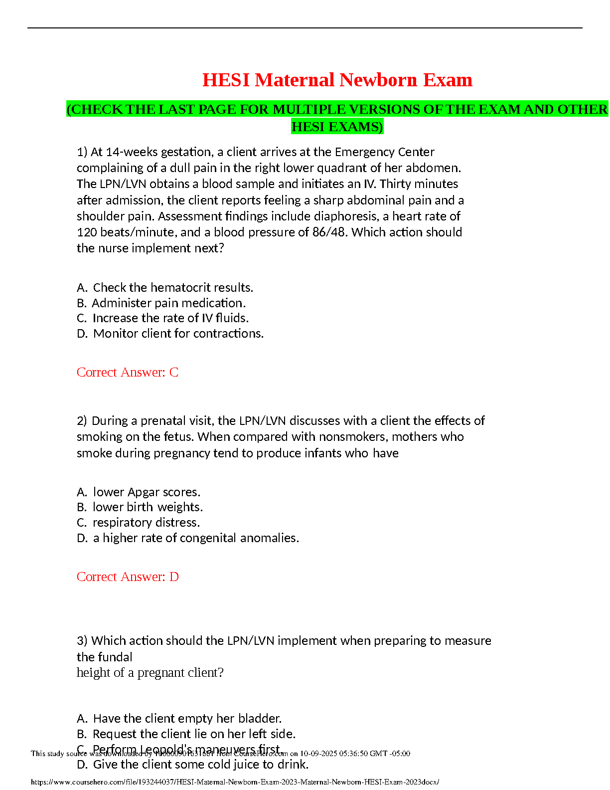 Ace your nursing exams with our latest 2024/2025 HESI Maternal Newborn Exam Test Bank. This comprehensive resource is packed with verified questions and detailed answers, covering all essential topics in maternity and newborn care. It's the ultimate study guide designed to help you master the material, boost your confidence, and pass your HESI exam on the first attempt, steering you clear of costly resits.