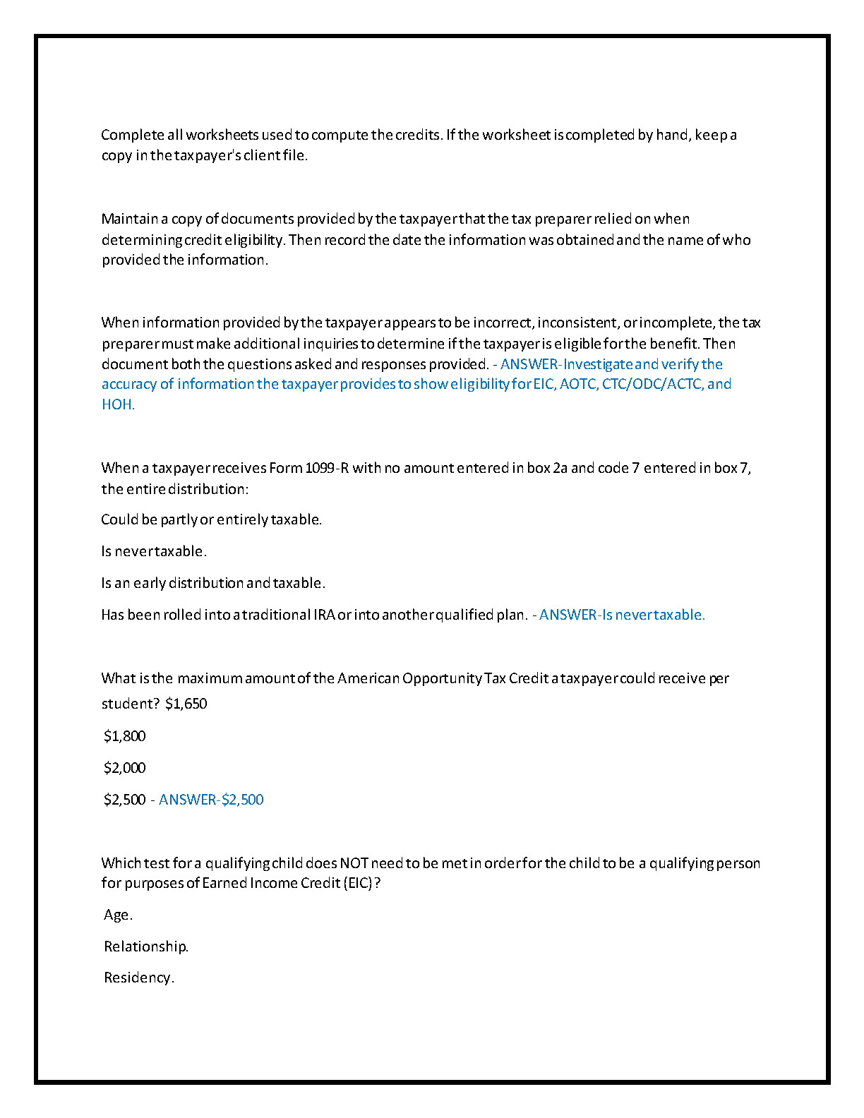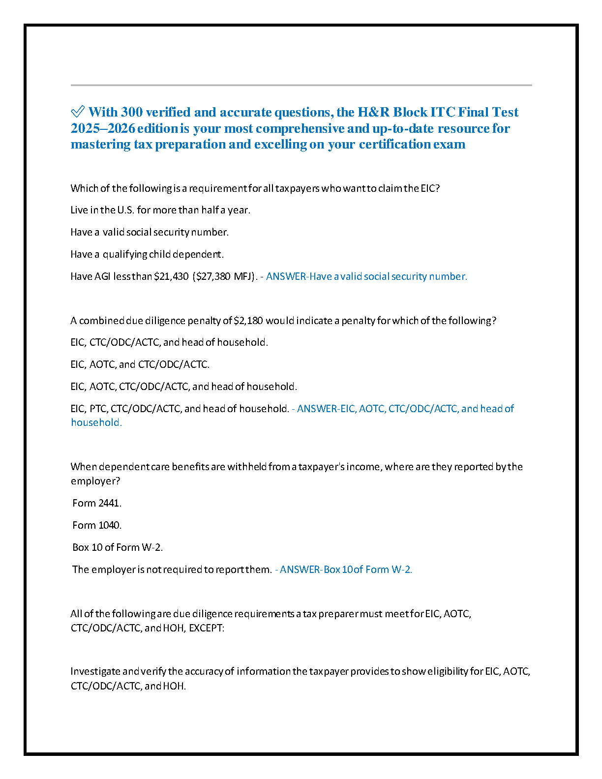 Ace your H&R Block Income Tax Course (ITC) final exam with our comprehensive test bank for the 2025-2026 academic year. This essential study guide features 300 meticulously verified questions and A+ graded answers, designed to mirror the actual exam format and content. Updated with the latest IRS regulations and H&R Block guidelines, this resource covers everything from fundamental tax laws to complex, real-world scenarios. Prepare effectively, build your confidence, and ensure you're fully equipped to succeed on your first attempt. Ideal for ITC students, aspiring tax preparers, and professionals seeking to refresh their knowledge.