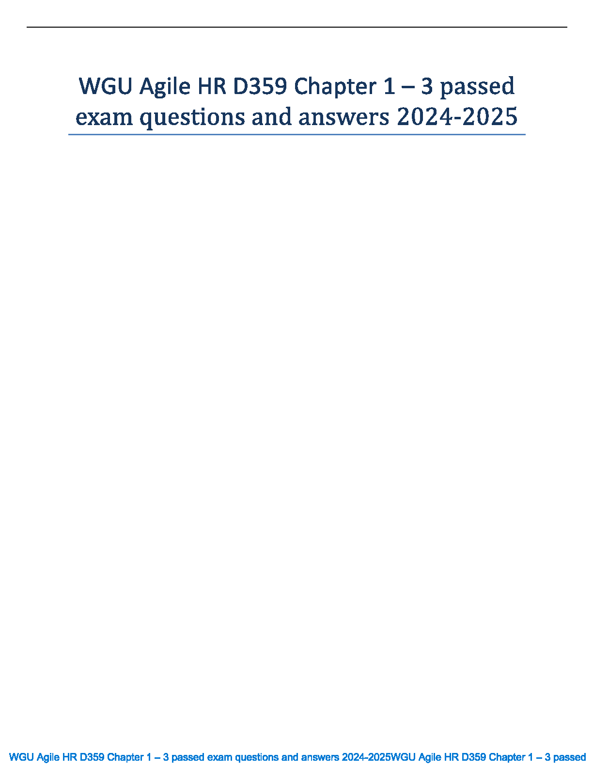 Ace your WGU D359 Agile HR course with this comprehensive test bank covering Chapters 1-3. This newly updated 2024-2025 resource is meticulously compiled with real, passed exam questions and their correct, verified answers. It's the ultimate study tool designed to help you master the core concepts of Agile Human Resources and pass your exams confidently on the first try. Stop worrying about resits and secure your A grade today by focusing on the questions that matter most.