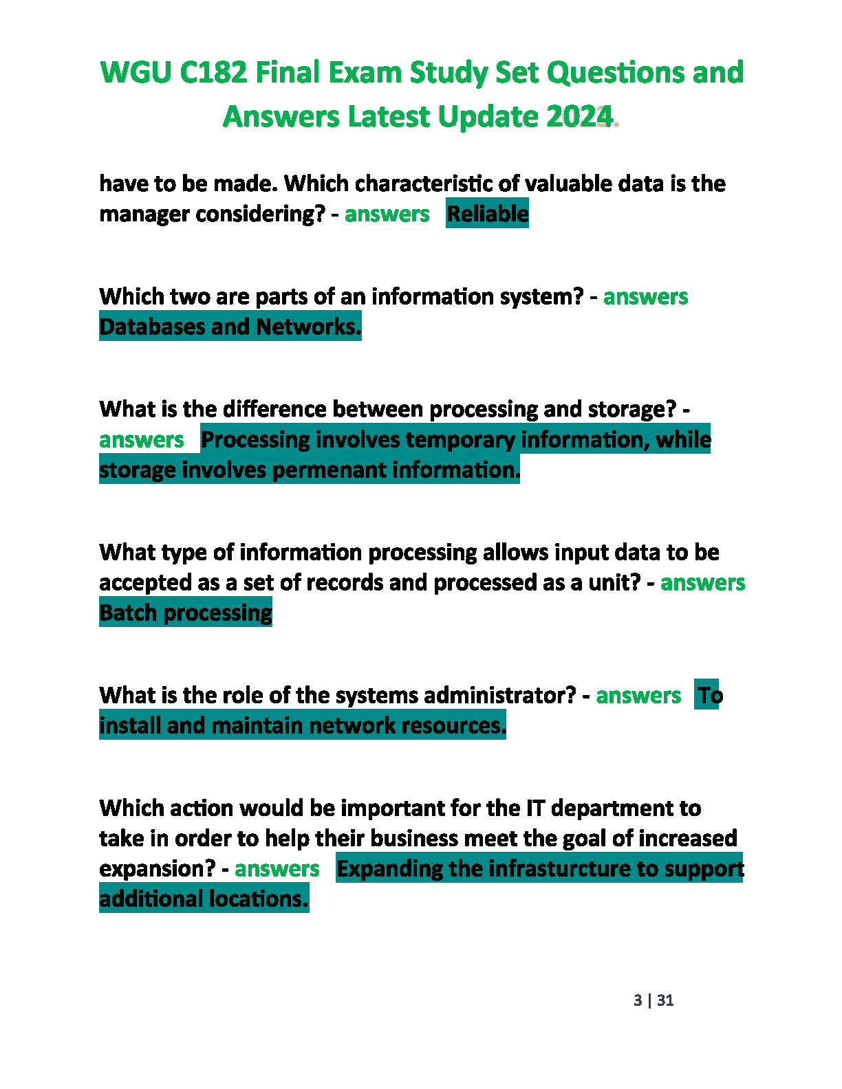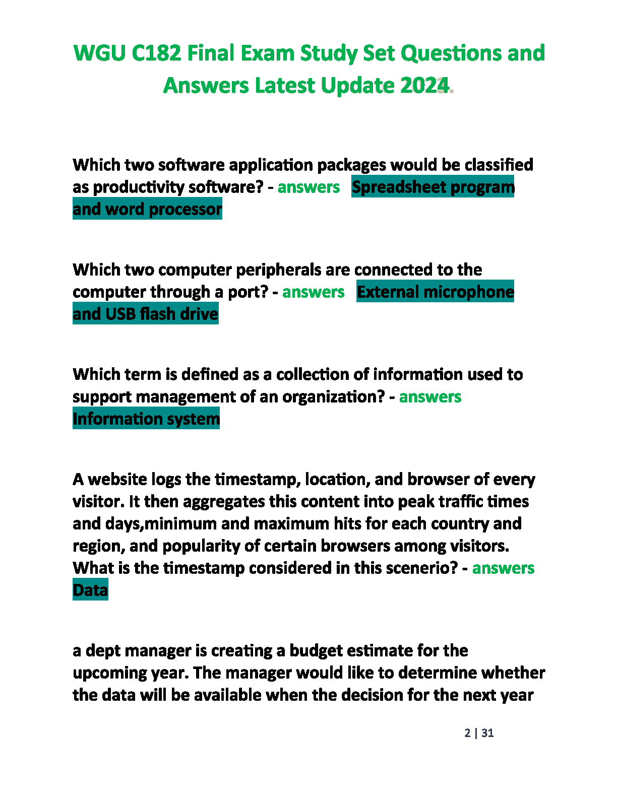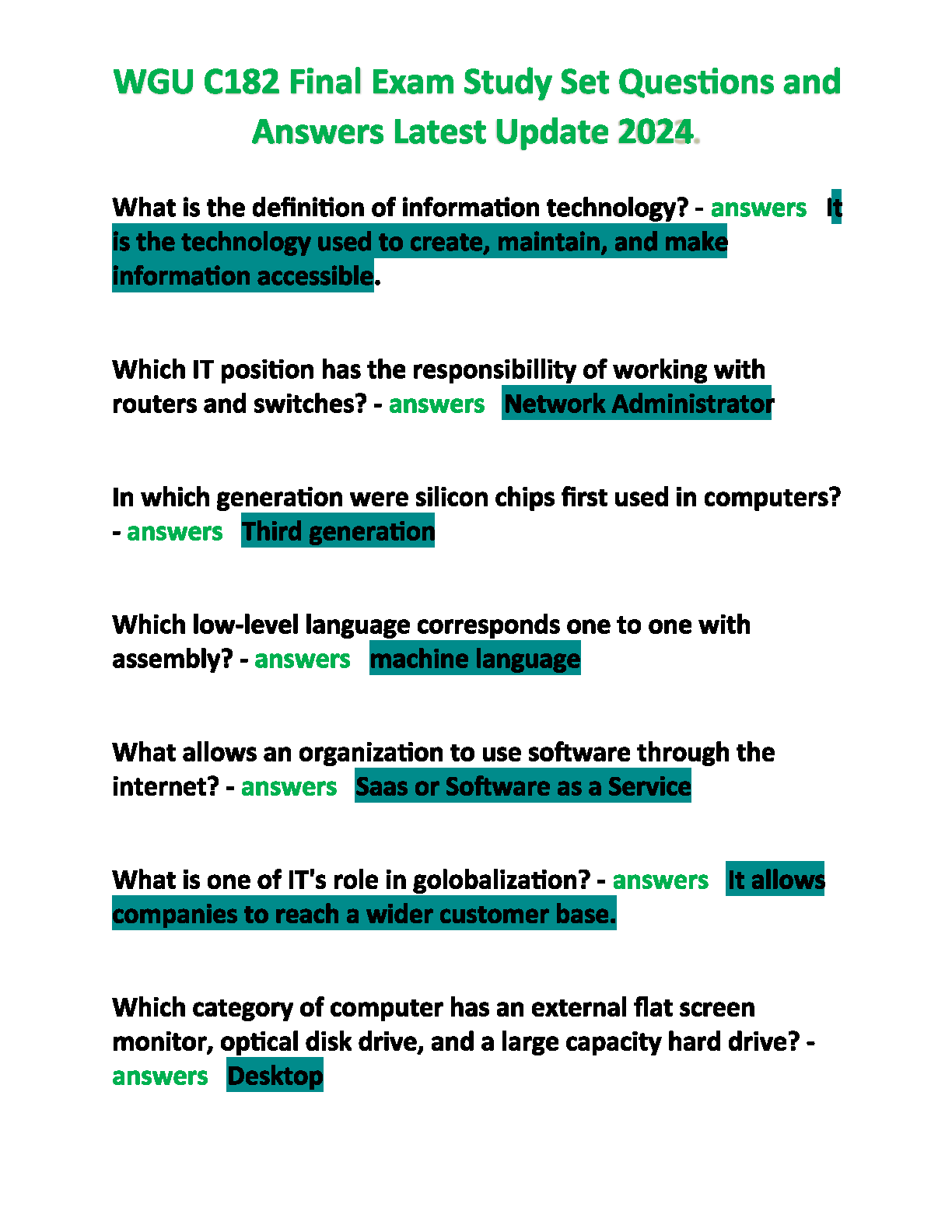 Unlock success in your WGU C182 Introduction to IT course with this comprehensive final exam test bank, fully updated for 2024. This study guide provides a complete set of verified questions and accurate answers covering all critical course concepts, from the definition of information technology and hardware components to networking, software as a service (SaaS), and the role of IT in globalization. Designed to streamline your study process, this resource is your key to mastering the material and passing your final exam with confidence on your first attempt.