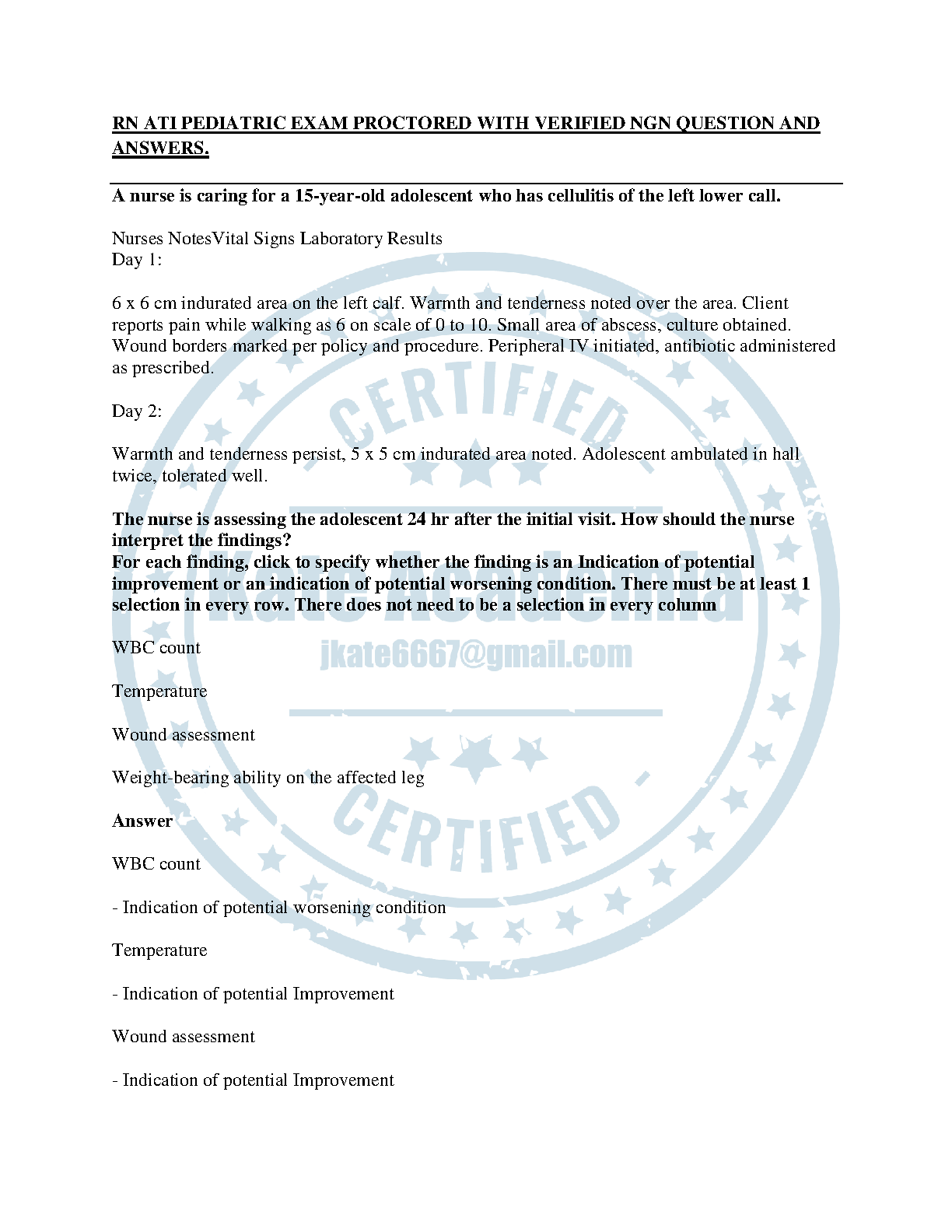 Ace your nursing exams with our latest 2025/2026 RN ATI Pediatric Proctored Exam study guide. This comprehensive resource is packed with verified NGN (Next Generation) questions and detailed answers, meticulously designed to help you pass on your first attempt. Dive into realistic case studies, like the included example on pediatric cellulitis, to sharpen your clinical judgment and master complex nursing concepts. Avoid the stress of resits by preparing with the most up-to-date and relevant material. Get instant access and start studying smart for your pediatric nursing certification.