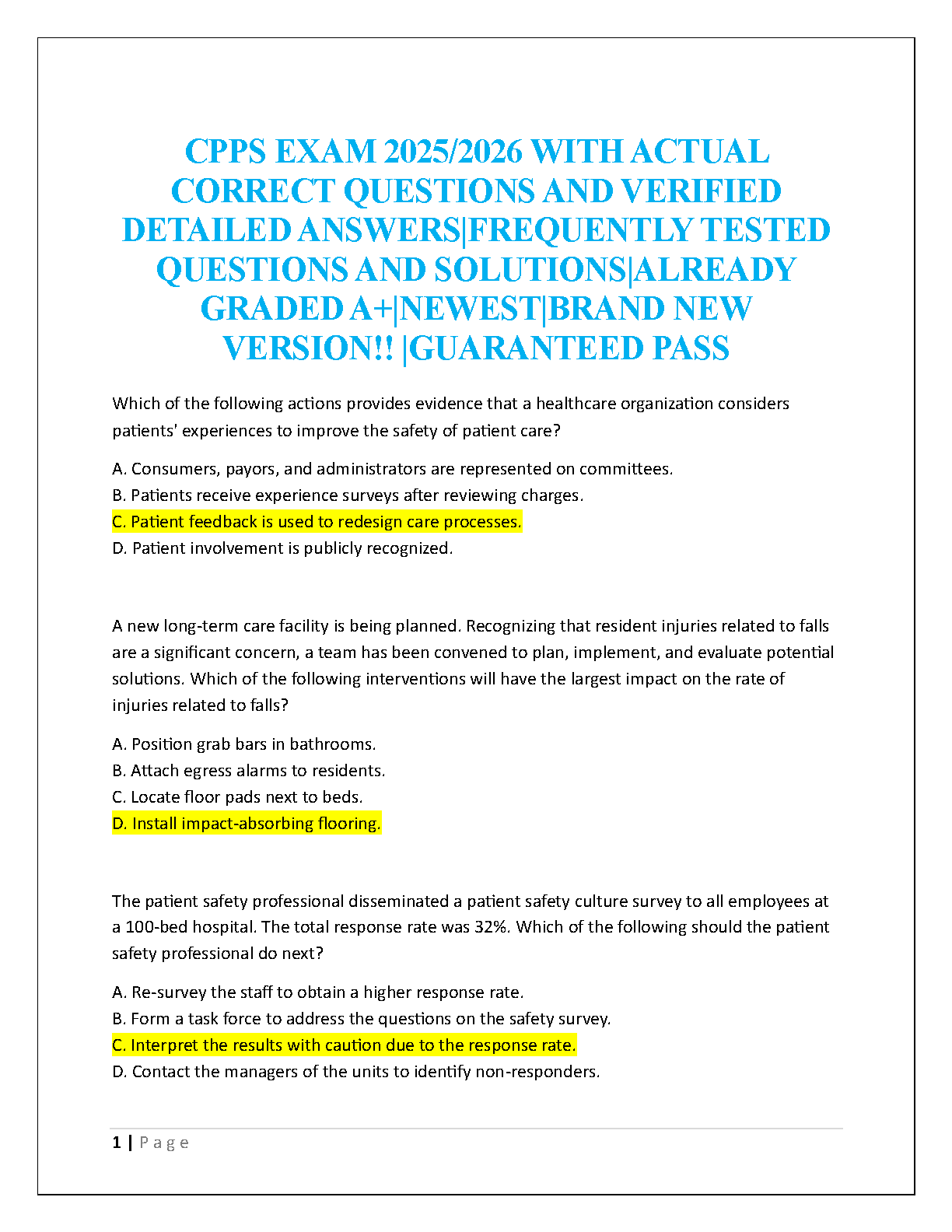 Unlock your potential and secure your Certified Professional in Patient Safety (CPPS) certification with our premier test bank for the 2025/2026 exam season. This comprehensive study resource is packed with a wide array of actual exam questions, each accompanied by detailed, verified answers and solutions. Our material covers all the critical topics and frequently tested concepts you'll face on the real exam. Designed to help you study smarter, not harder, this A+ graded test bank is your ultimate tool to build confidence, master the content, and pass the CPPS exam on your very first try. Say goodbye to exam anxiety and avoid costly resits with this guaranteed pass solution.
