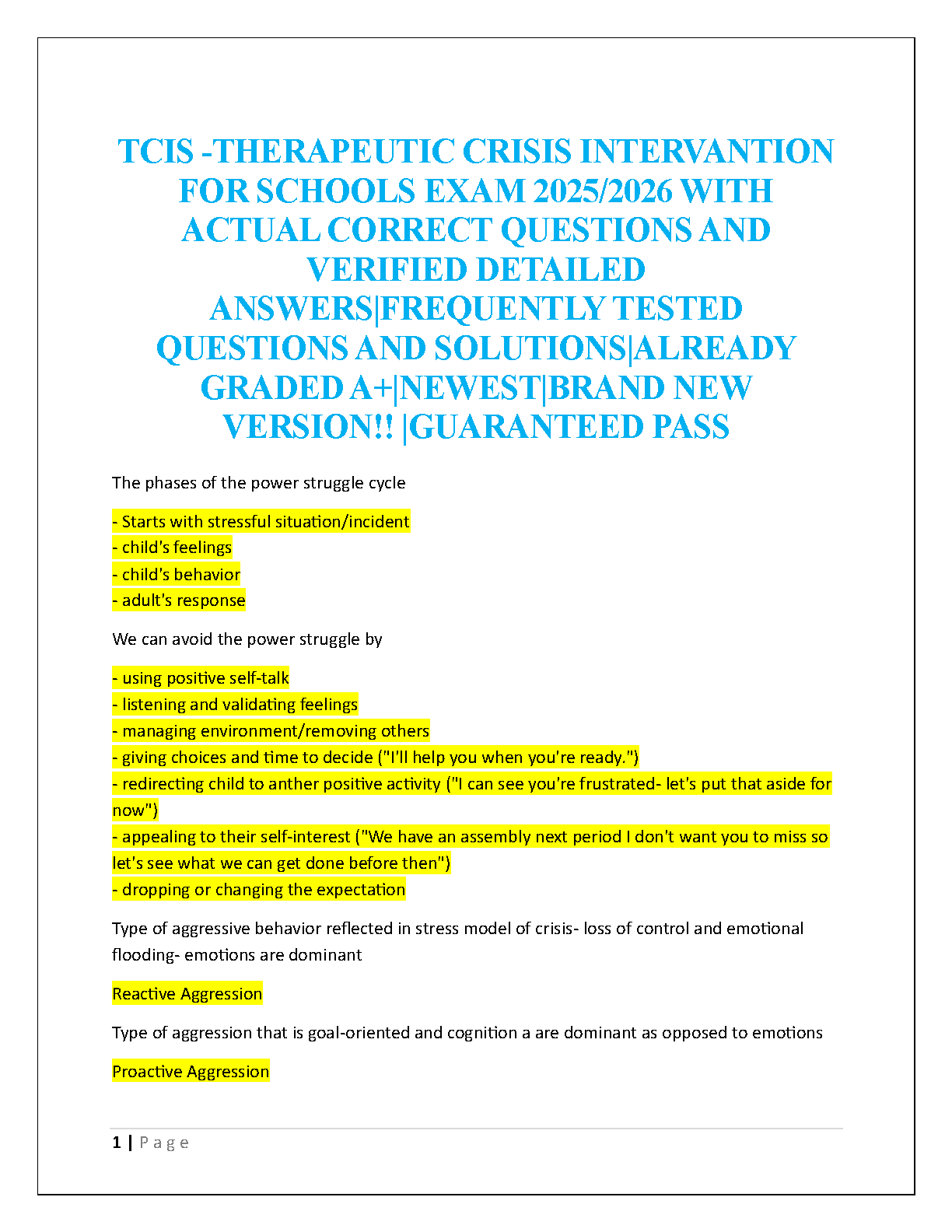 Prepare for your TCIS for Schools certification with this comprehensive test bank for the 2025/2026 academic year. This resource, based on the principles developed by Martha J. Holden, Michael A. Nunno, and Nicholas J. Long, provides a complete collection of frequently tested exam questions and meticulously verified answers. Master key concepts such as the power struggle cycle, de-escalation techniques, and different types of aggression. This A+ graded guide is your ultimate tool to study effectively, build confidence, and pass the Therapeutic Crisis Intervention for Schools exam on your first attempt. Achieve certification with this guaranteed-to-pass study material.