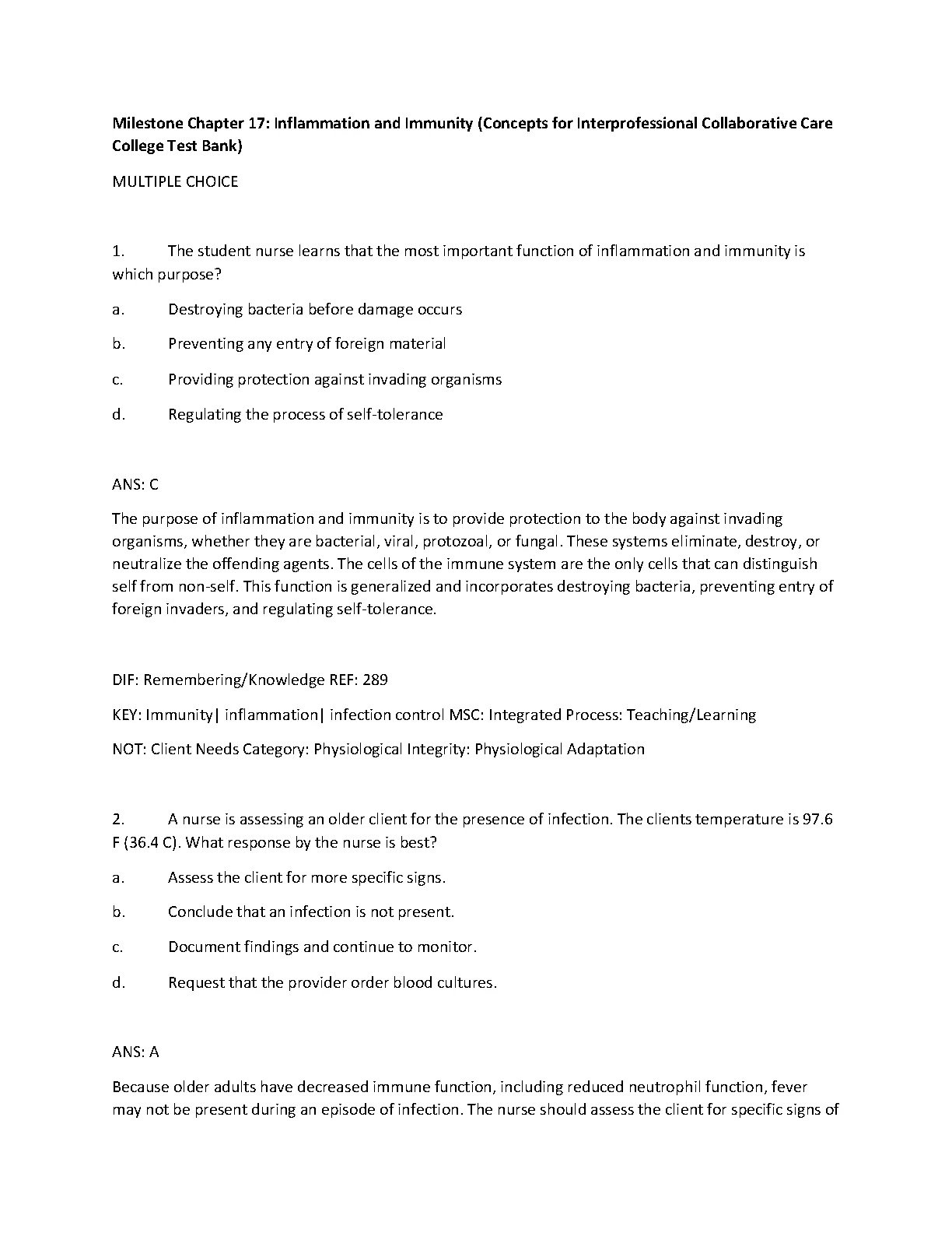 Milestone Chapter 17 Inflammation and Immunity (Concepts for Interprofessional Collaborative Care College Test Bank)
