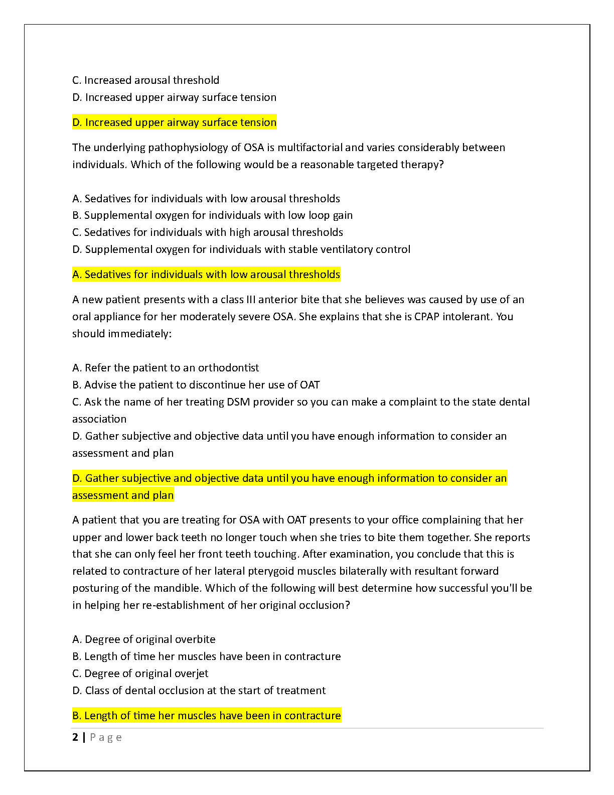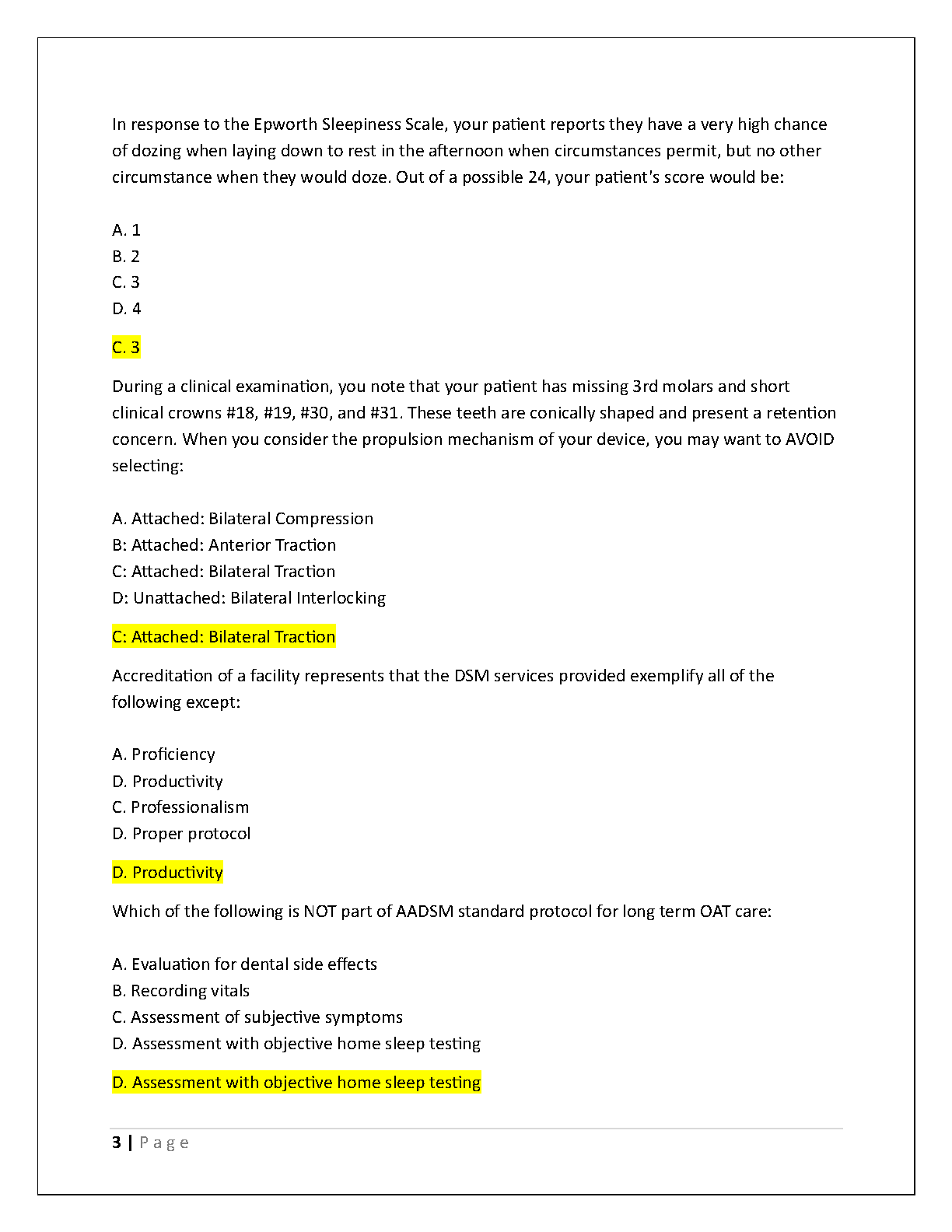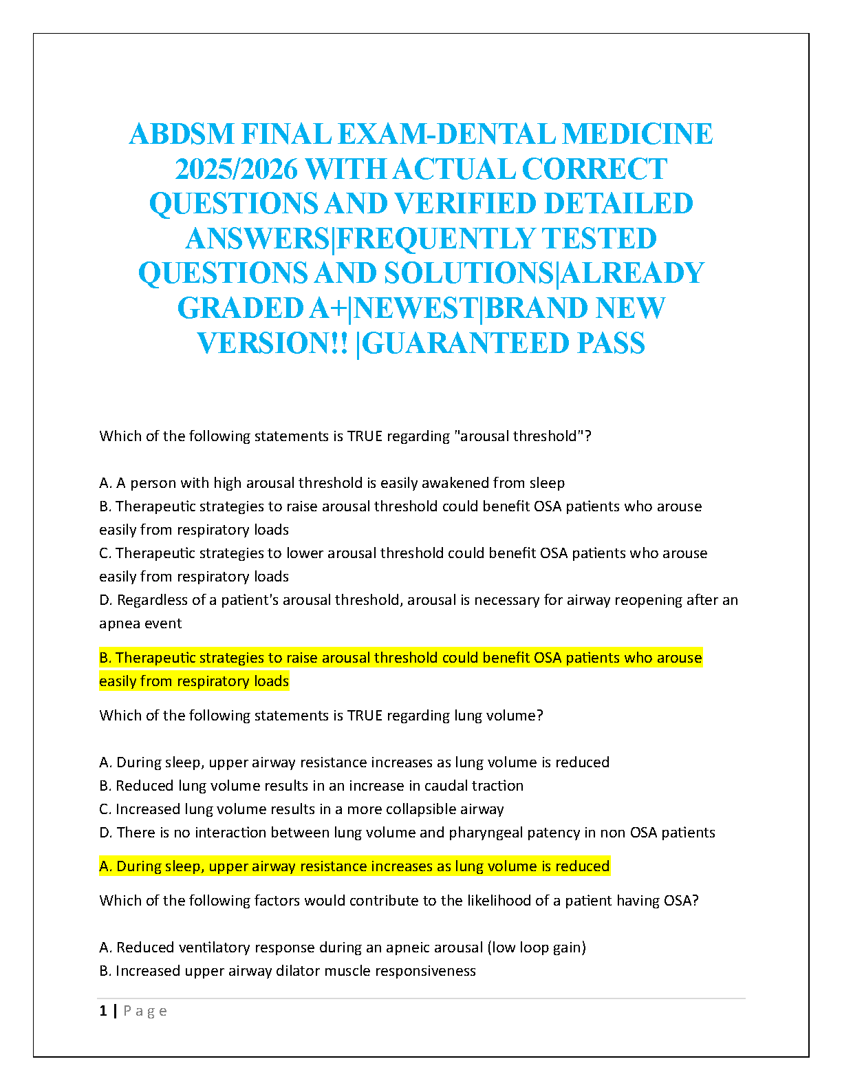 Ace your American Board of Dental Sleep Medicine (ABDSM) Final Exam with our latest 2025/2026 edition test bank. This comprehensive resource provides a complete collection of frequently tested questions, each with verified, detailed answers to ensure a deep understanding of dental medicine concepts. Designed to help you pass on your first attempt and achieve an A+ grade, this guide is your key to success, eliminating the need for resits. Download now for a guaranteed pass and confidently step into your certification exam.