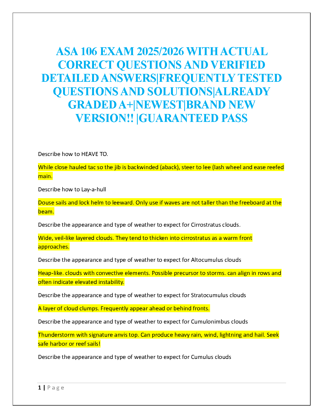 Prepare to ace your American Sailing Association (ASA) 106 Advanced Coastal Cruising certification with our comprehensive 2025/2026 test bank. This guide is packed with actual, frequently tested exam questions and meticulously verified answers. Covering essential topics from advanced sailing maneuvers like heaving to and laying-a-hull to critical weather knowledge and cloud identification, this A+ graded resource is your key to success. Don't leave your certification to chance—use this brand-new, updated study guide to pass confidently on your first attempt and avoid any resits. Sail through your exam with ease!