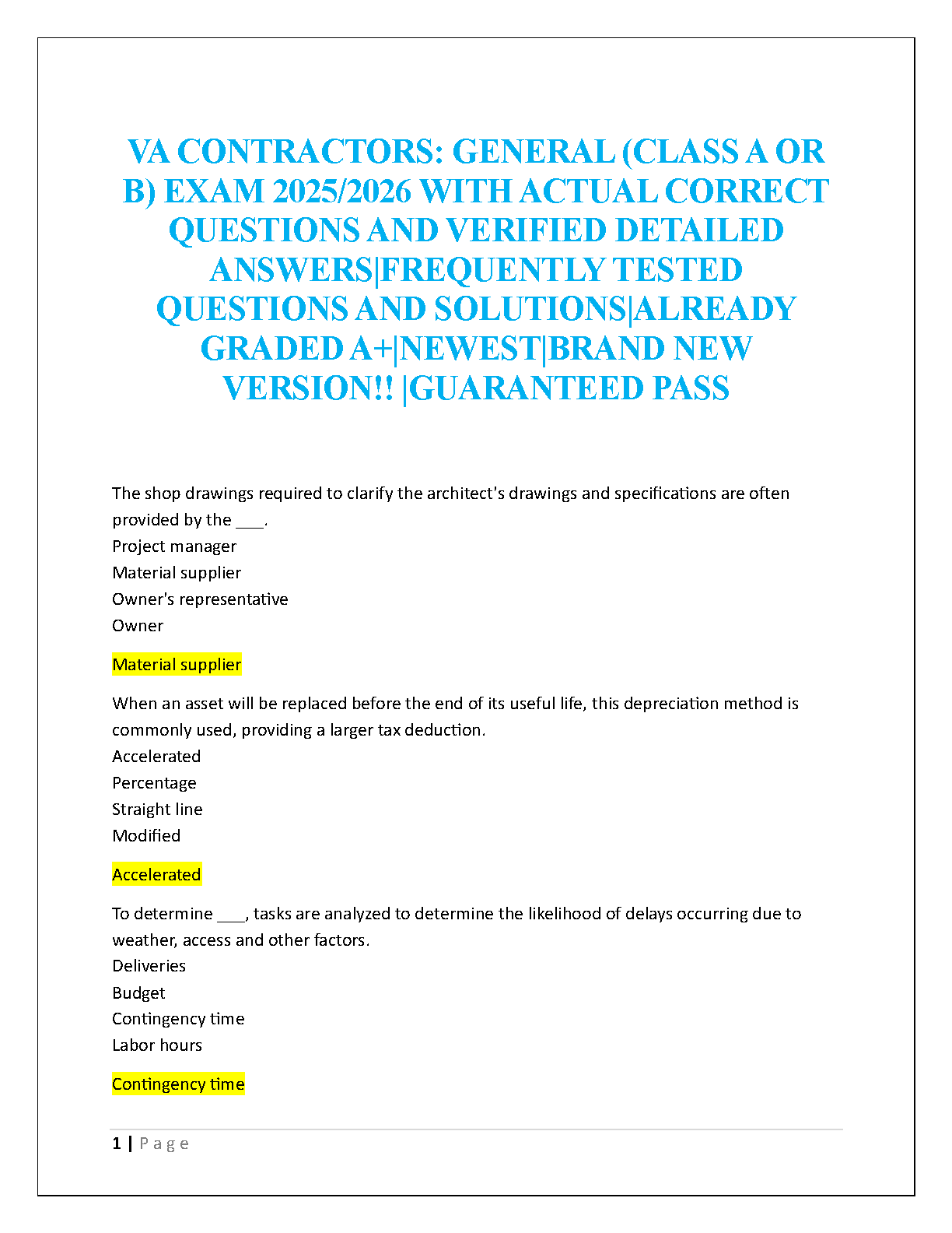 Prepare to ace your Virginia (VA) Contractors General Exam for Class A or B with our newly updated 2025/2026 Test Bank. This essential study resource is meticulously designed to ensure you pass on your very first attempt, eliminating the stress of resits. Inside, you'll find a comprehensive collection of actual, frequently tested exam questions, each paired with a verified, 100% correct answer. This A+ graded material provides the most relevant and up-to-date content, giving you the confidence to tackle the real exam. Achieve a guaranteed pass and get your contractor license without delay!