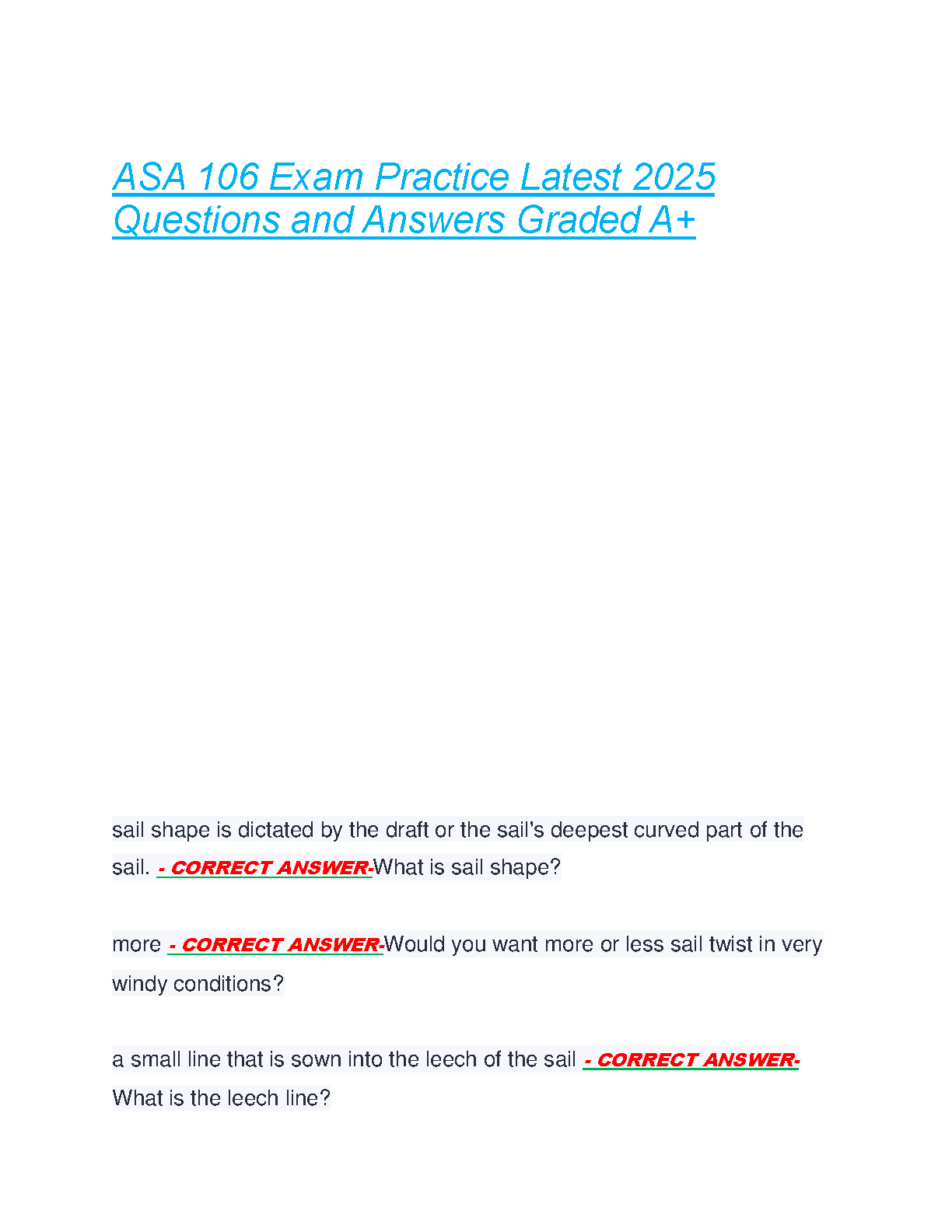 Prepare for your American Sailing Association (ASA) 106 Advanced Coastal Cruising certification with our comprehensive test bank. This 2025 updated guide features a complete collection of exam questions paired with verified, expert-checked answers. Master key concepts like sail shape, navigation, and offshore safety to ensure you're fully prepared. Achieve a top grade (Graded A+) and pass your ASA 106 exam with confidence using these essential practice materials.