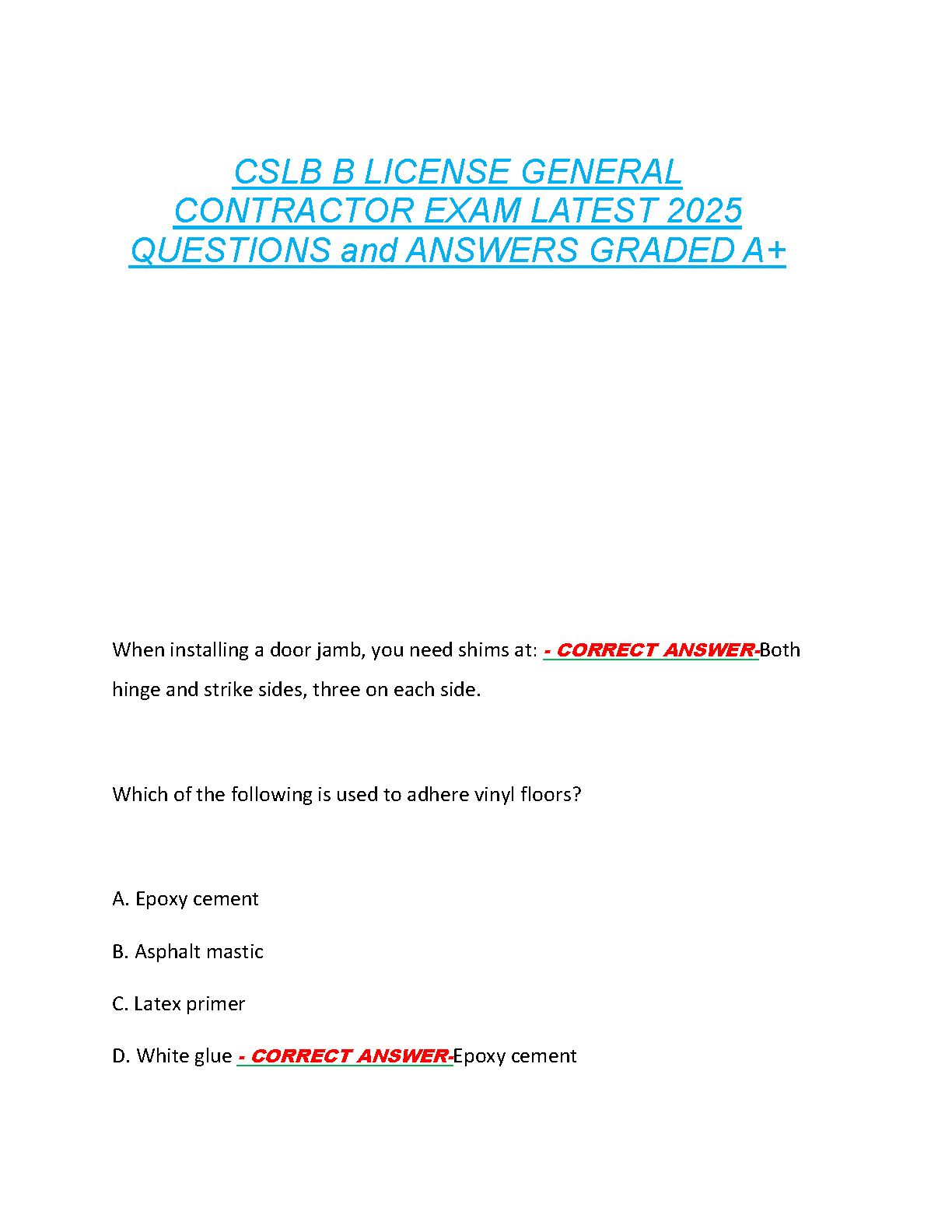 Get fully prepared to ace your California CSLB B License General Contractor Exam with our latest 2025/2026 edition test bank. This comprehensive study guide is packed with up-to-date questions and detailed, A+ graded answers covering all essential topics. Master the material, build your confidence, and ensure you pass the general contractor exam on your very first attempt. Avoid costly resits and fast-track your career with this essential preparation tool.