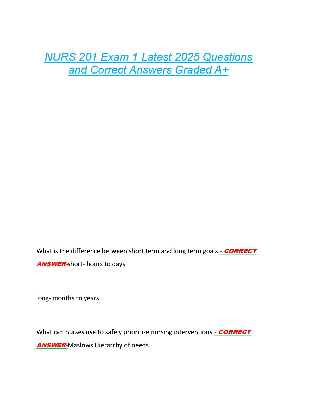 Prepare to ace your NURS 201 Exam 1 with our latest test bank for the 2025/2026 academic year. This essential study resource is meticulously designed to help you master the course material and pass your exam on the very first try, eliminating the stress of resits. Inside, you'll find a comprehensive collection of exam-style questions paired with 100% correct, expert-verified answers. Our guide covers critical nursing concepts, ensuring you have the knowledge and confidence to achieve an A+ grade. Don't just study—study smart and secure your success in NURS 201.