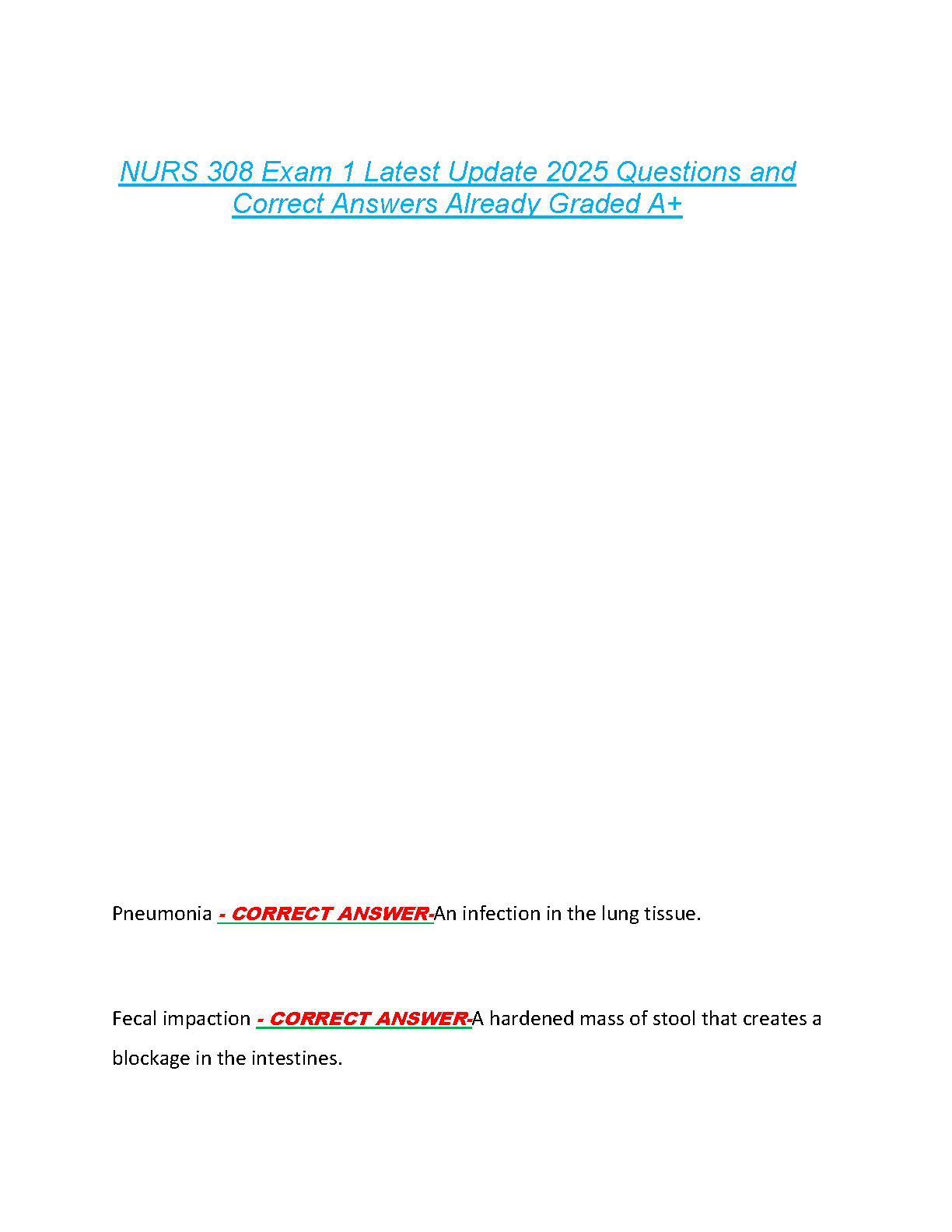 Ace your NURS 308 Exam 1 on the first attempt with our comprehensive Test Bank for the 2025/2026 academic year. This ultimate study guide is packed with the latest exam-style questions and 100% correct, verified answers, already graded A+. Covering key topics essential for your nursing curriculum, this resource is designed to help you study smarter, not harder. Avoid resits and secure the top grade you deserve. Download now and start preparing for success!