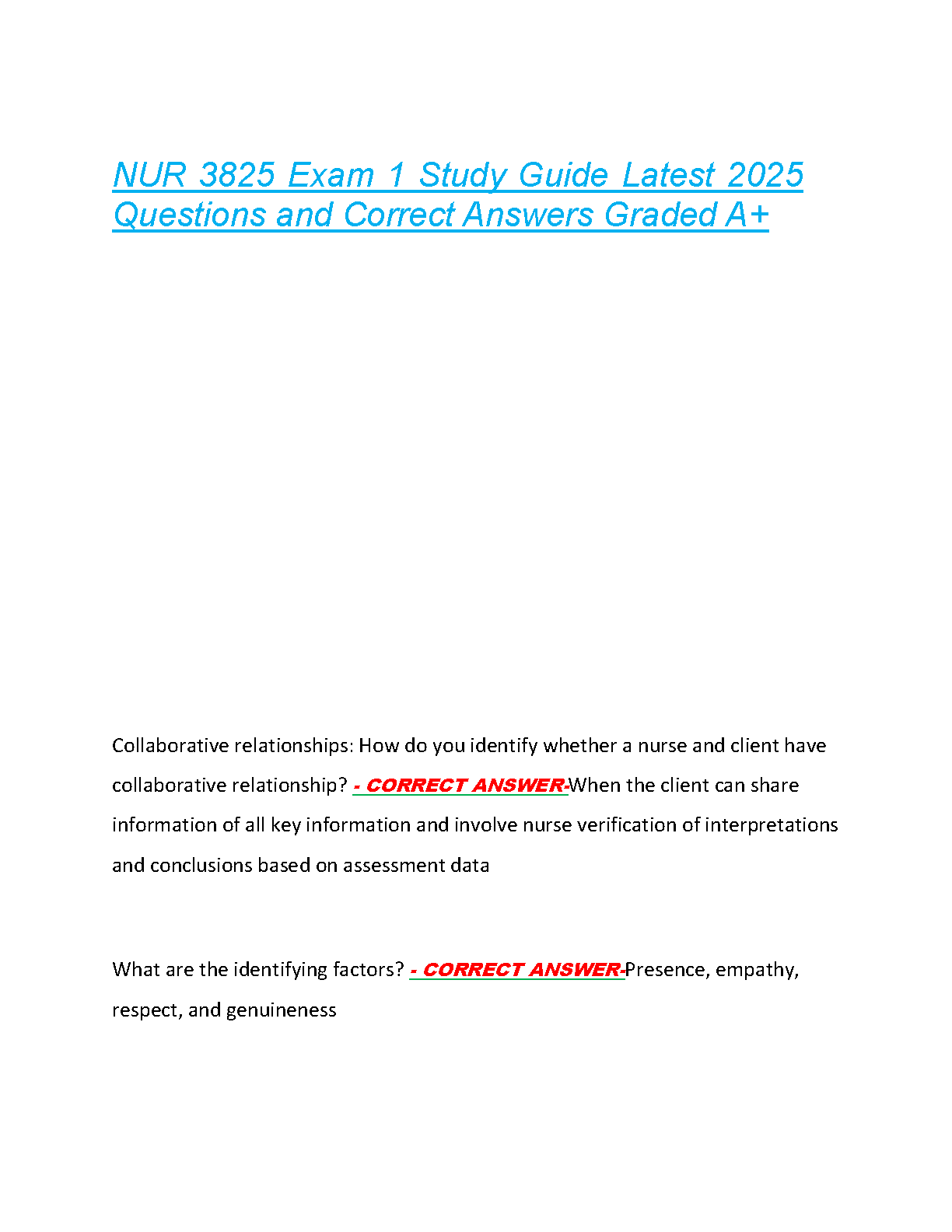 Ace your NUR 3825 Exam 1 with this ultimate study guide and test bank for the 2025 academic year. This comprehensive resource is expertly designed to help you master crucial nursing concepts and pass your exam on the first attempt, avoiding costly resits. Inside, you'll find a complete collection of exam-style questions paired with 100% accurate, verified answers, covering key topics such as collaborative nurse-client relationships. This guide is your key to not just passing, but achieving an A+ grade. Download now and start studying smarter!