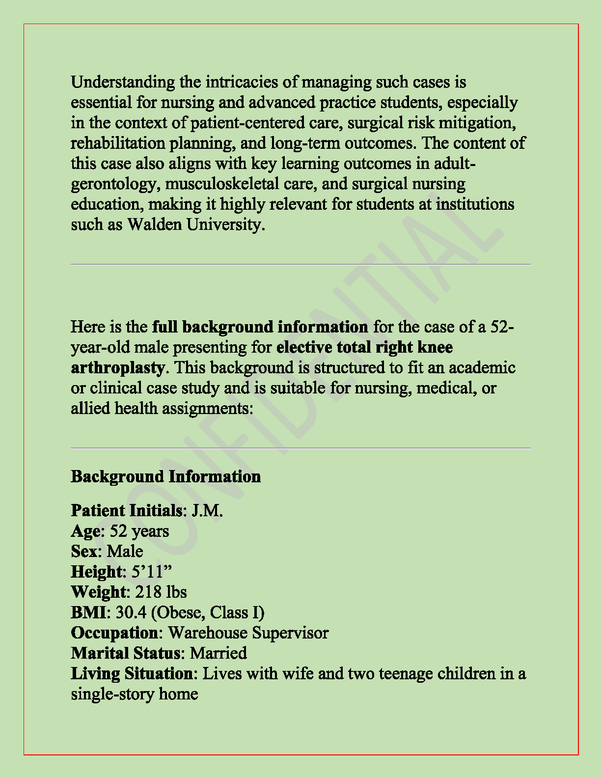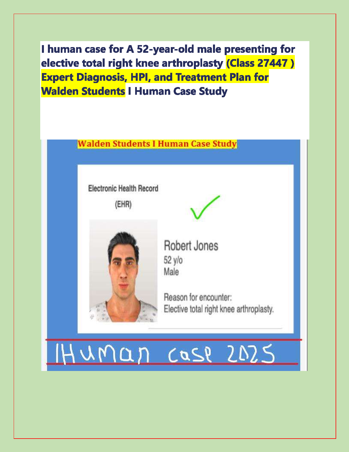 Unlock success in your Walden University nursing program with our definitive guide to the i-Human case of Robert Jones, a 52-year-old male patient presenting for total right knee arthroplasty. This latest 2025/2026 resource provides an in-depth analysis, including the complete History of Present Illness (HPI), accurate expert diagnosis, and a comprehensive treatment plan. Designed to help you master the simulation, excel in your coursework, and pass your exams confidently on the first attempt.