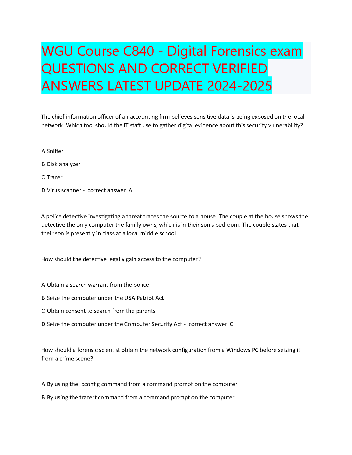 WGU C840 Digital Forensics Test Bank: Latest 2024-2025 Exam Questions and Correct Verified Answers