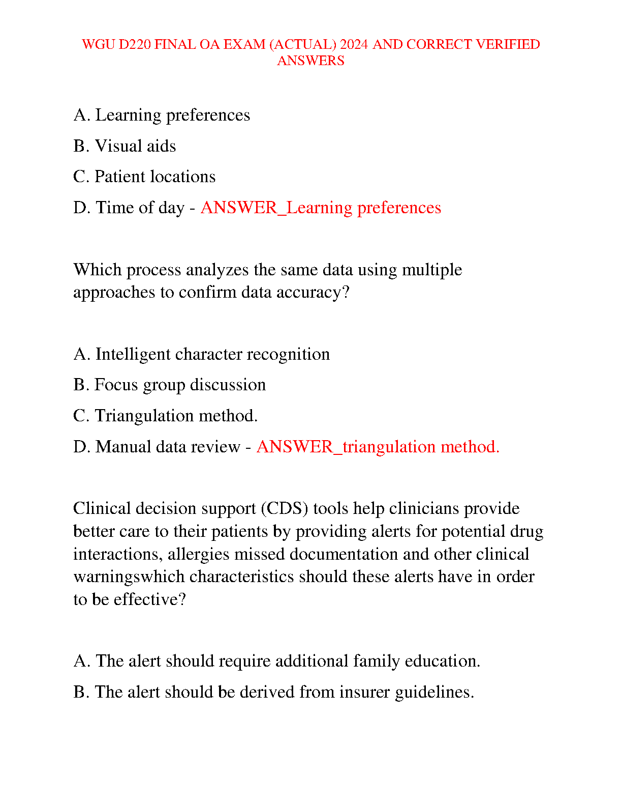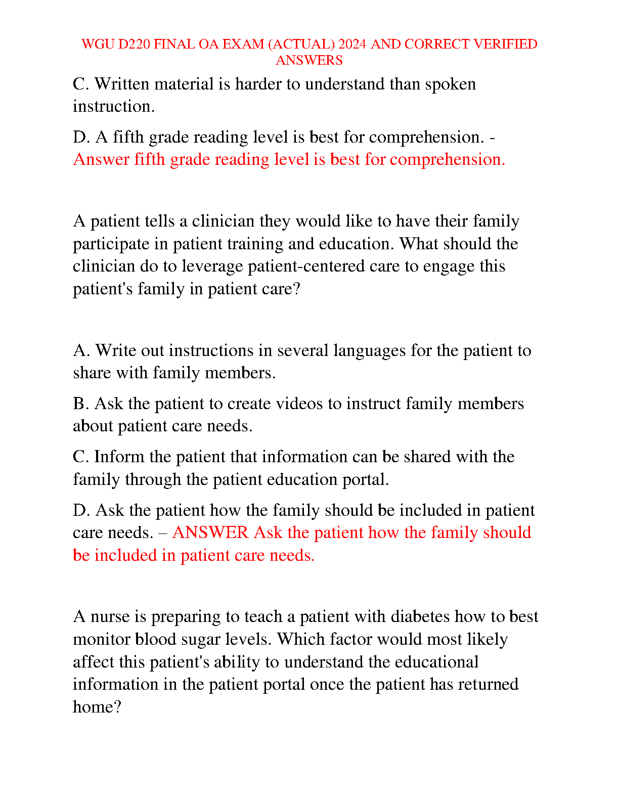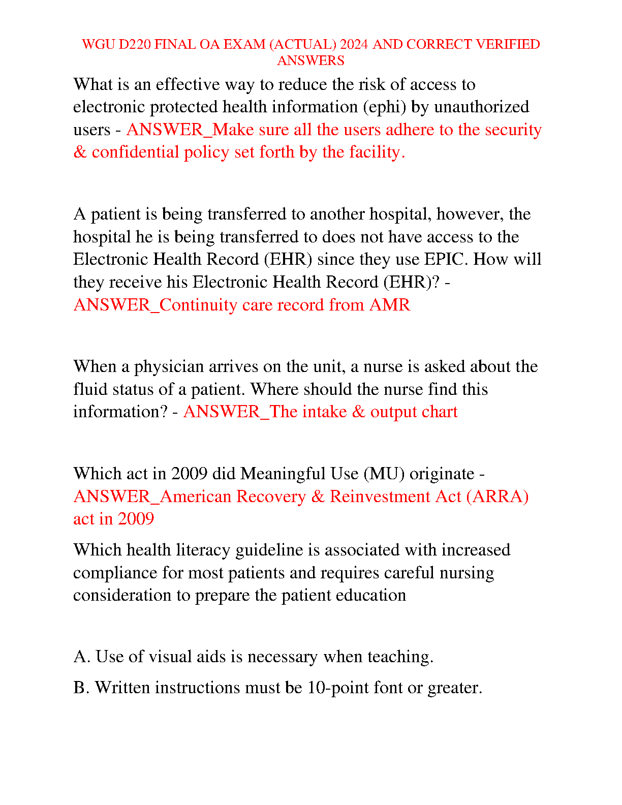 Ace your WGU D220 Information Technology in Nursing Practice Final Objective Assessment with this comprehensive 2024 test bank. This resource provides a collection of actual exam questions coupled with 100% correct, verified answers. Master key concepts such as ePHI security, EHR data exchange, the American Recovery & Reinvestment Act (ARRA), Meaningful Use, and health literacy guidelines. This is the ultimate study guide designed to help you pass your D220 final exam on your first attempt, ensuring you achieve an A+ grade. Download now for immediate access to the study material you need to succeed.