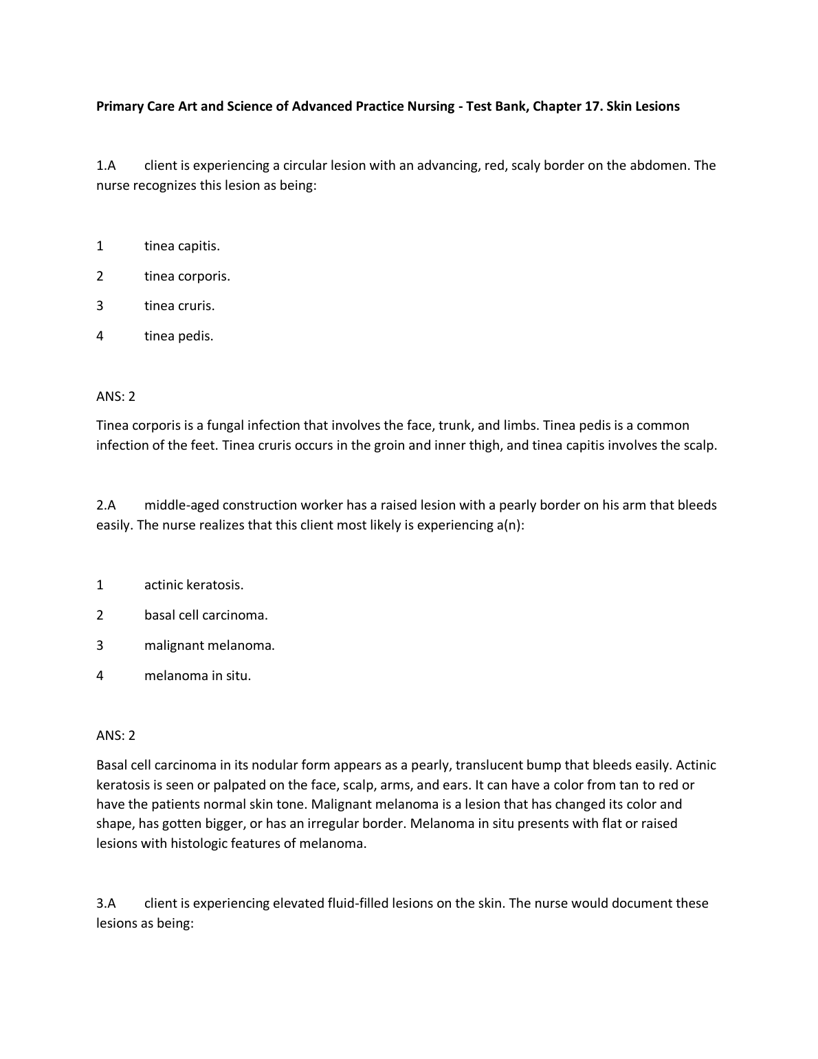 Primary Care Art and Science of Advanced Practice Nursing - Test Bank, Chapter 17. Skin Lesions