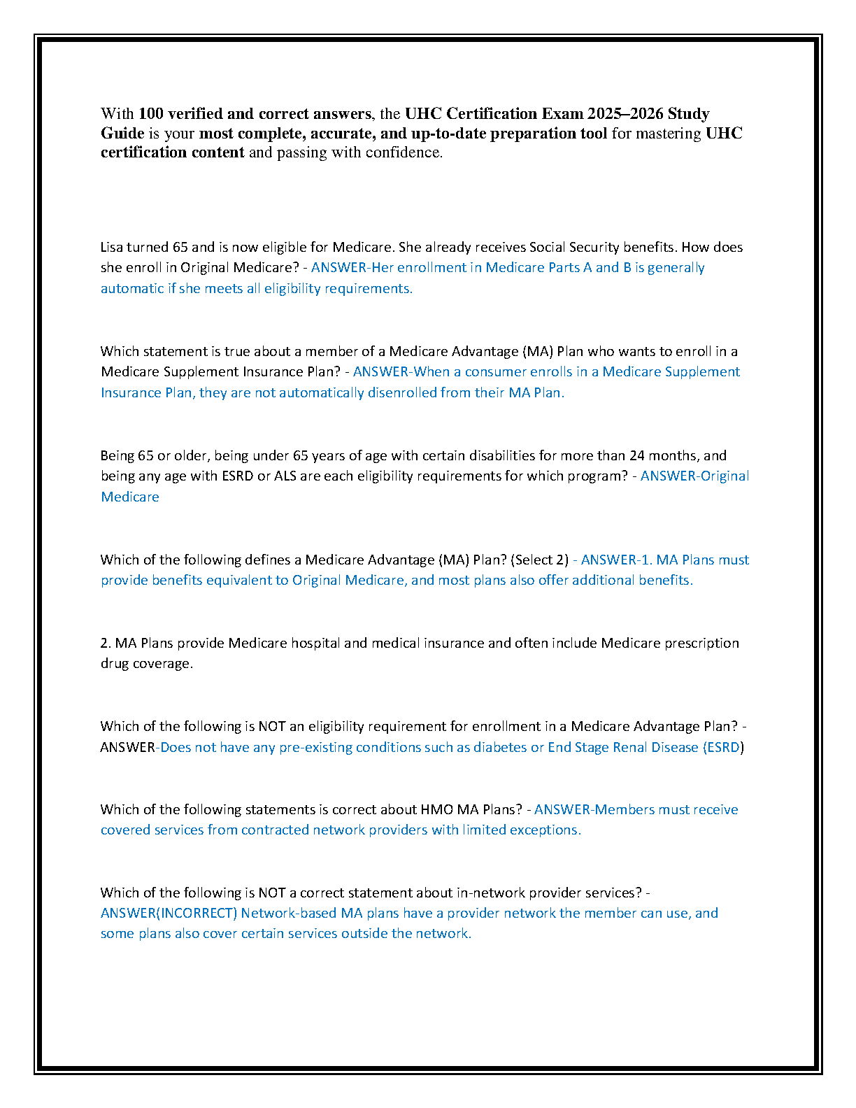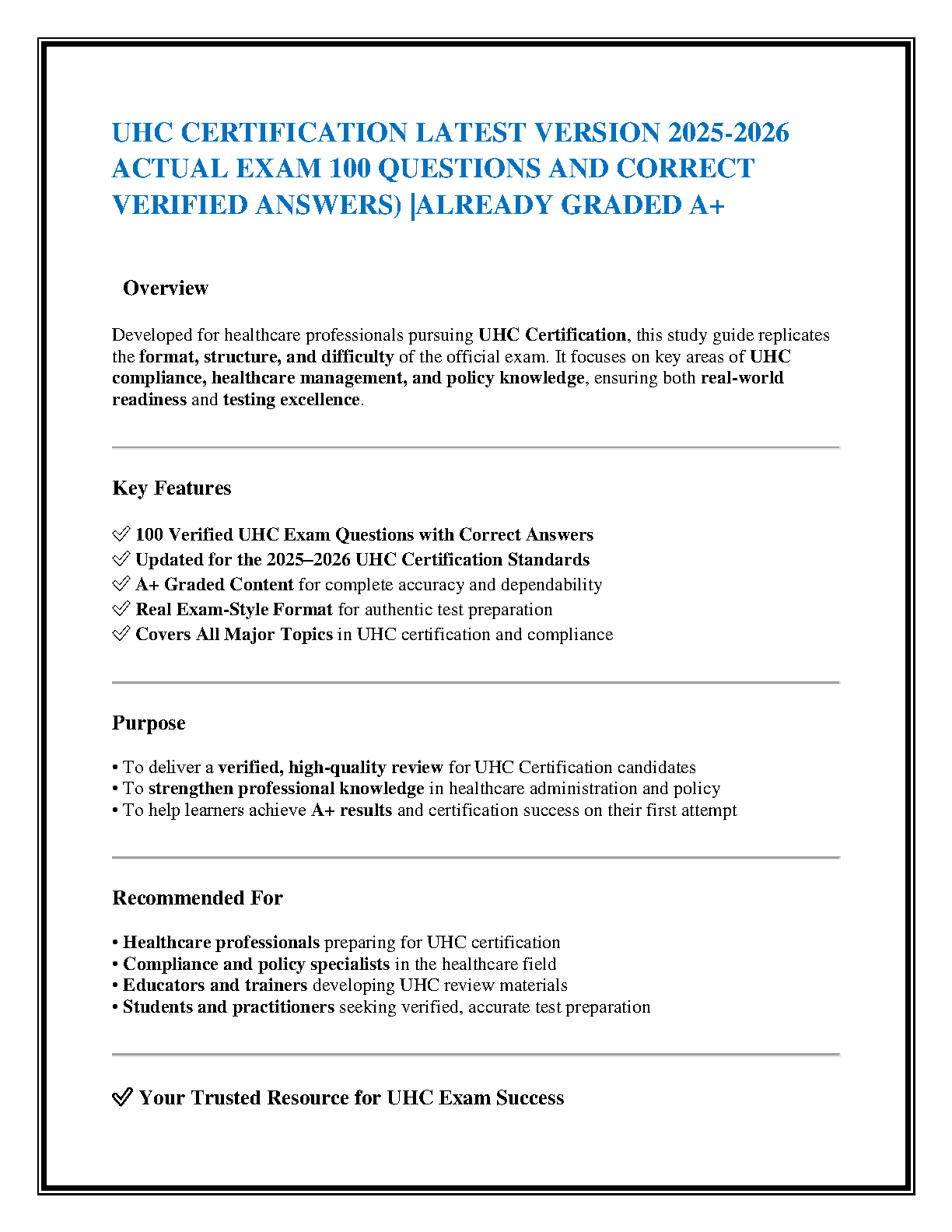 Prepare to pass your UHC Certification exam with confidence using our latest 2025-2026 Test Bank. This A+ graded resource features 100 verified questions with correct answers, meticulously designed to mirror the actual exam in format, structure, and difficulty. Covering all essential topics in UHC compliance, healthcare management, and policy, this guide is your key to mastering the material. Achieve certification success on your first attempt and avoid resits with this comprehensive and trusted study tool.