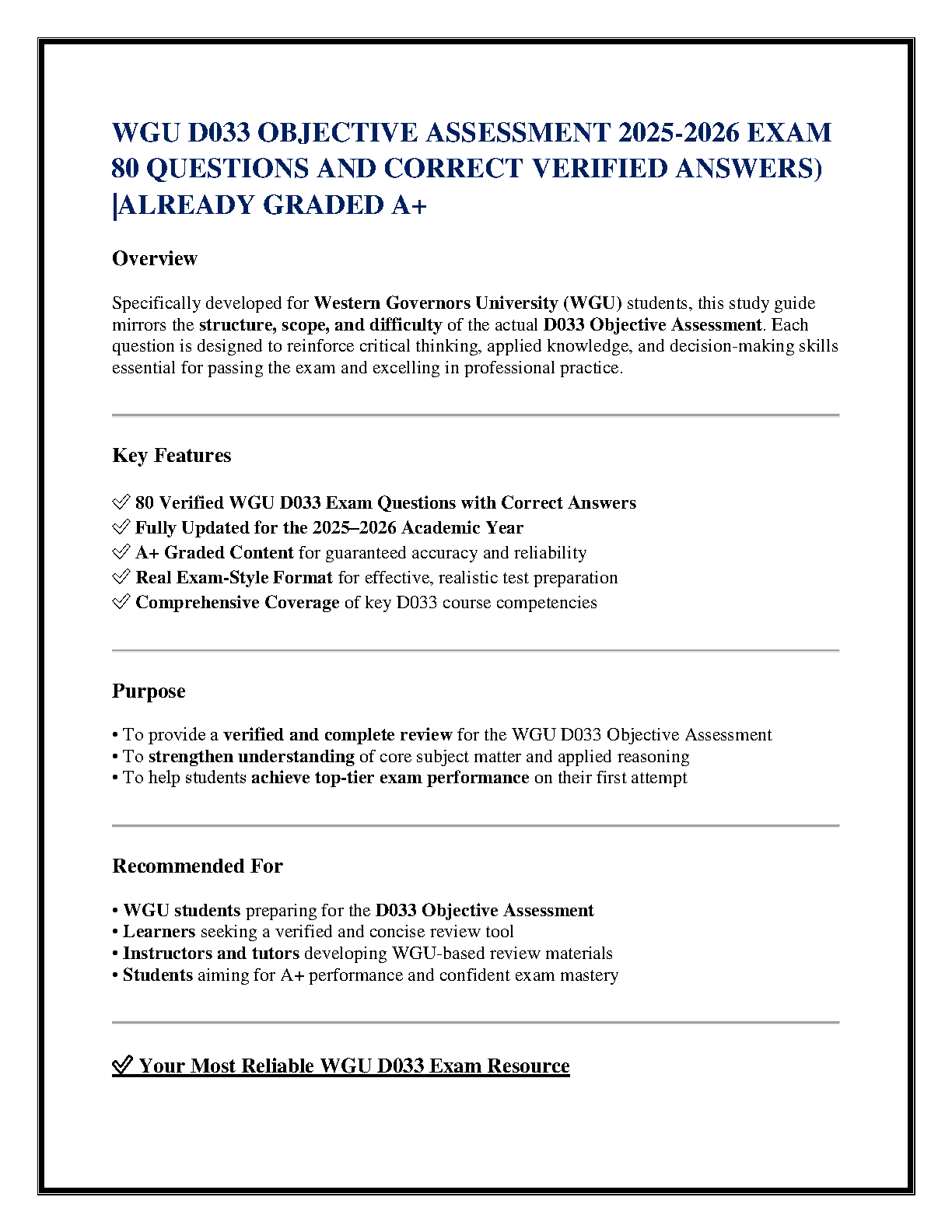 Unlock exam success with this comprehensive test bank for the WGU D033 Objective Assessment, fully updated for the 2025-2026 academic year. This essential study guide features 80 verified questions with correct, A+ graded answers, designed to mirror the real exam's format and difficulty. Strengthen your understanding of core concepts, enhance your critical thinking skills, and confidently pass on your first attempt. This resource is your most reliable tool for achieving top-tier performance and mastering the D033 course material.