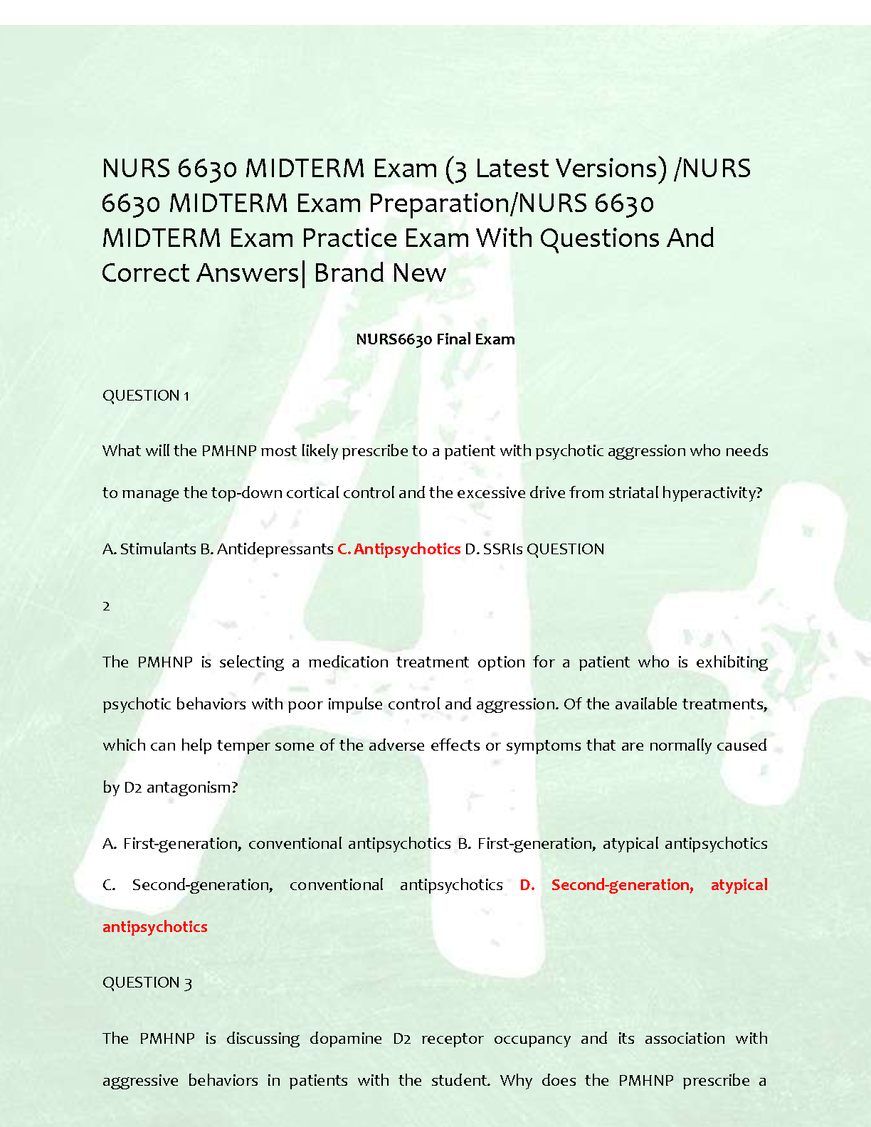 Instantly download the NURS 6630 Midterm Exam Test Bank, meticulously aligned with Stephen M. Stahl's 'Essential Psychopharmacology,' 5th Edition. This comprehensive package features three distinct, up-to-date versions of the exam, complete with detailed questions and 100% correct, verified answers. Master complex topics such as medication management for psychotic aggression, D2 antagonism, and various classes of psychotropics. This study guide is your ultimate tool for acing the NURS 6630 midterm, ensuring you grasp the core concepts for a first-time pass and excel in your psychopharmacology course.