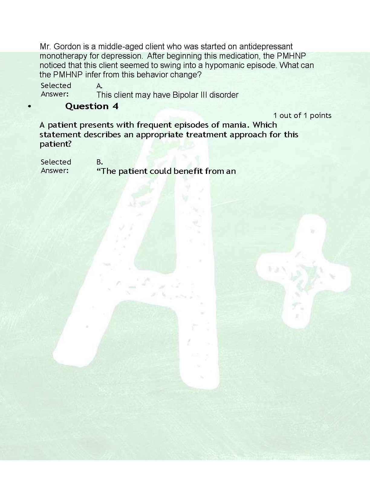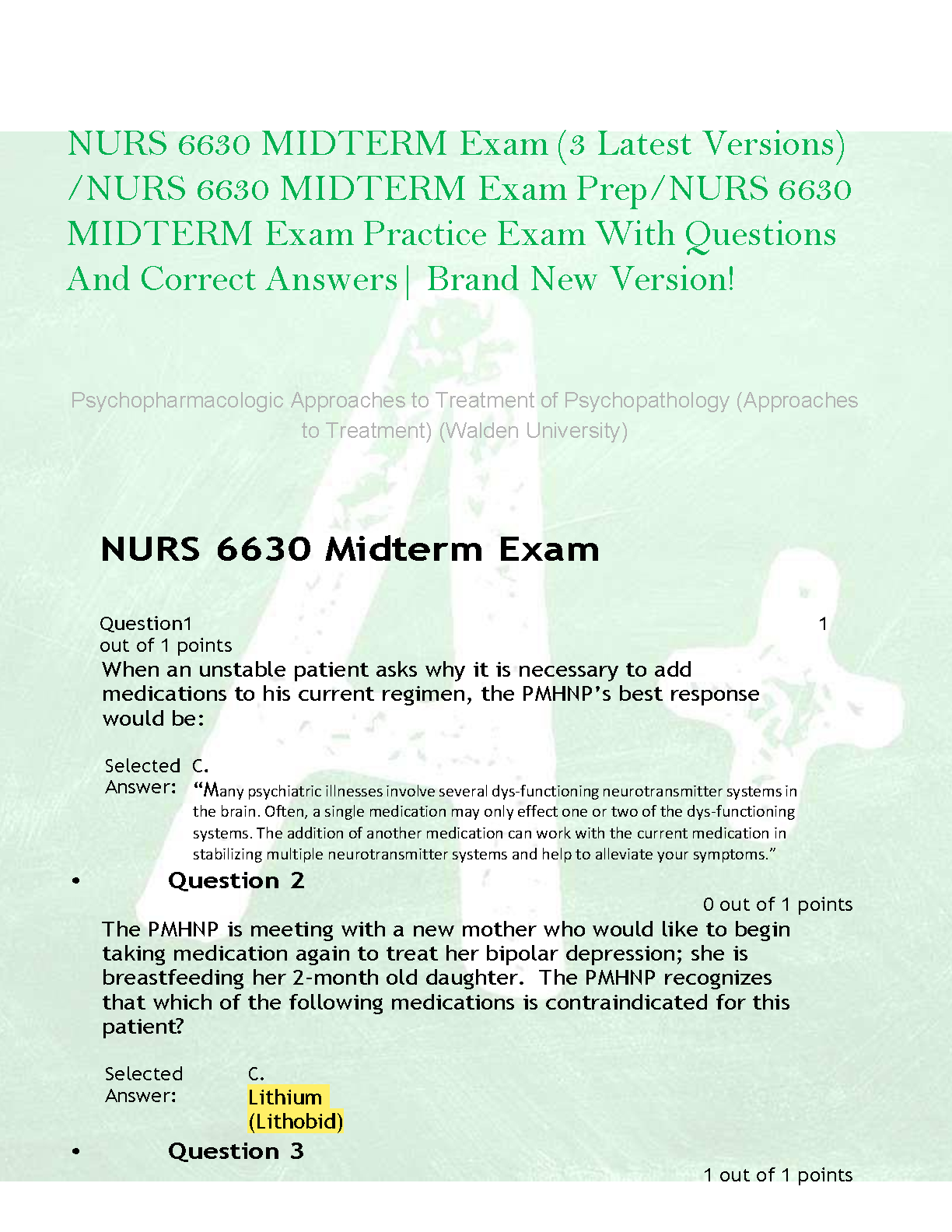 Get ready to ace your NURS 6630 Midterm Exam with this comprehensive test bank! This resource provides three complete and distinct versions of the midterm exam for the 'Psychopharmacologic Approaches to Treatment of Psychopathology' course at Walden University. Each version is packed with questions and verified correct answers, directly aligned with the key concepts from Stahl's Essential Psychopharmacology, 5th Edition. Use this test bank to practice, identify your weak spots, and gain the confidence to excel on your exam. It's the perfect study tool for any PMHNP student looking to master complex psychopharmacology topics.