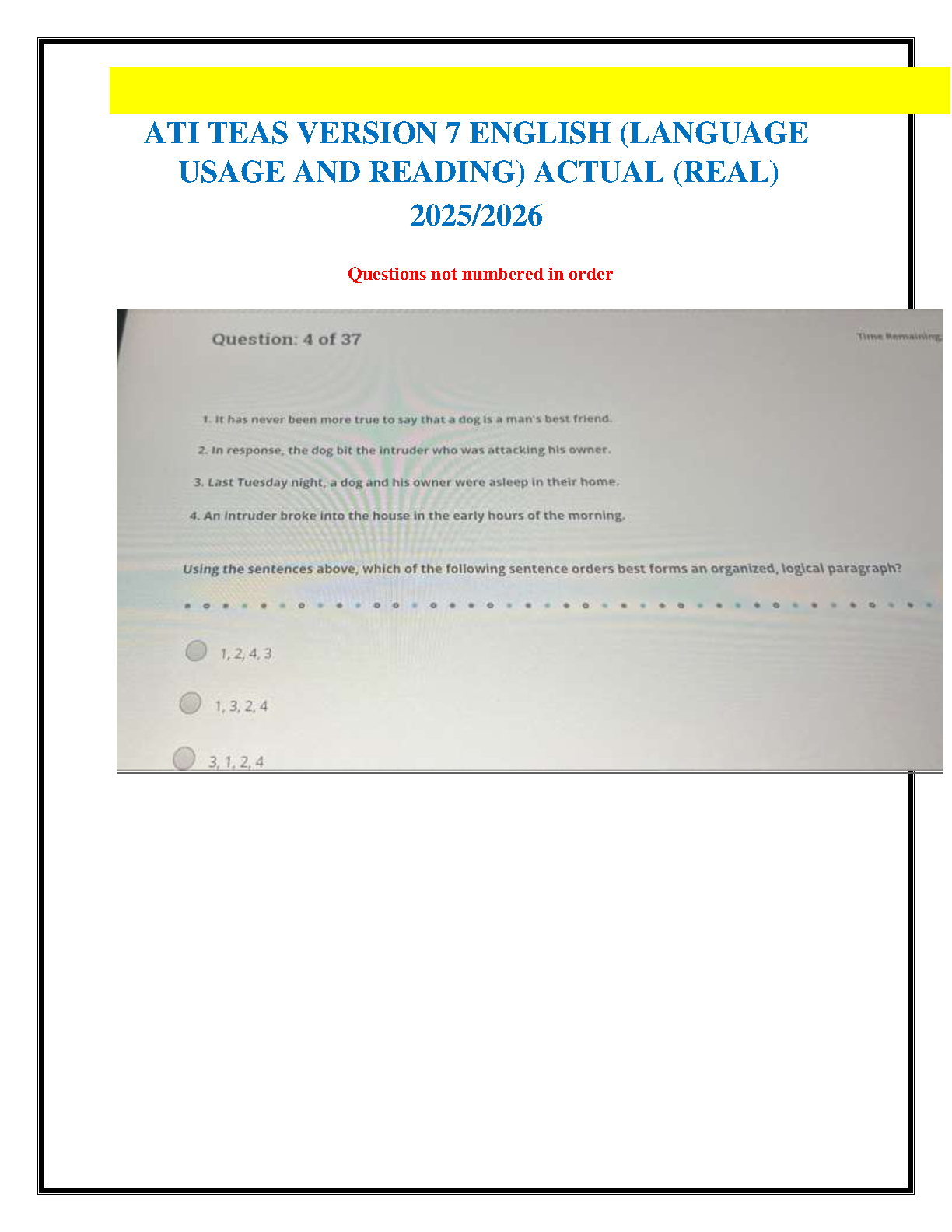 Get ready to excel on the English & Language Usage section of your nursing entrance exam with our latest ATI TEAS Version 7 Test Bank for the 2025-2026 academic year. This comprehensive resource is packed with actual, up-to-date exam questions and detailed answers, covering all key topics in reading comprehension, grammar, and language usage. Designed to mirror the real test experience, this study guide is your ultimate tool to build confidence, master the material, and pass the TEAS 7 on your very first try. Don't leave your score to chance—secure your spot in nursing school by preparing with the best!