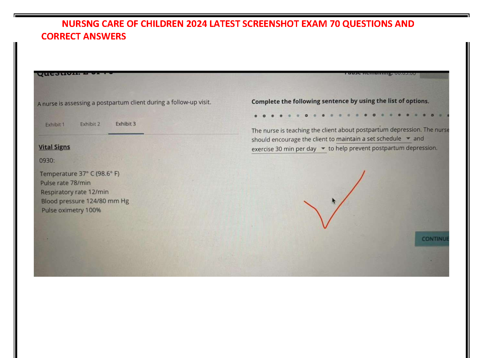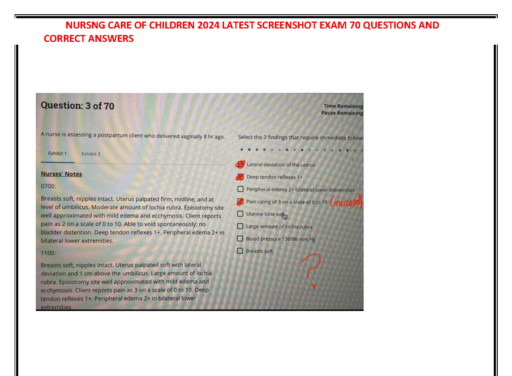 Master your pediatric nursing course with our comprehensive Exam Bank for Nursing Care of Children, updated for the 2024-2026 academic year. This essential study guide features 70 exam-style questions, complete with verified correct answers, presented in a clear screenshot format. Designed to mirror real testing environments, this resource covers critical topics and complex scenarios to help you build confidence, deepen your understanding, and excel in your exams. Get the edge you need to succeed in your pediatric nursing studies.