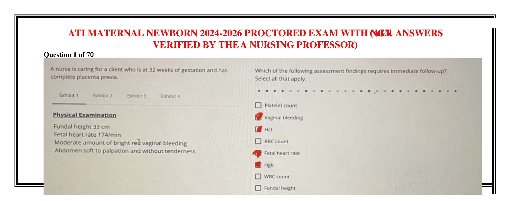 Master your ATI Maternal Newborn nursing course with our latest 2024-2026 Proctored Exam Test Bank. This essential study guide is meticulously designed to help you excel in your exams and pass on your first try. It features a comprehensive collection of 70 NGN-style questions, complete with detailed answers verified by nursing professors. Prepare effectively for the real proctored exam by practicing with questions covering critical topics like placenta previa and other essential maternal-newborn concepts. Gain the confidence you need to succeed in your nursing studies with this up-to-date and reliable resource.