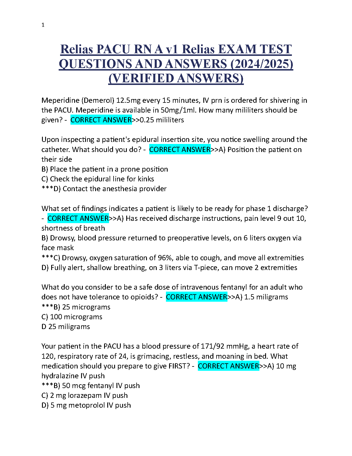 Ace your Relias Post-Anesthesia Care Unit (PACU) RN A v1 certification with this comprehensive test bank for the 2024-2025 testing cycle. This essential study guide features a complete collection of exam-style questions, each accompanied by a verified, 100% correct answer. Designed to help you master critical concepts in post-anesthesia care, this resource covers key topics you'll face on the actual exam. Prepare confidently, identify your weak points, and ensure you pass on your first attempt. Download now to get immediate access to the ultimate preparation tool for the Relias PACU RN A v1 exam.