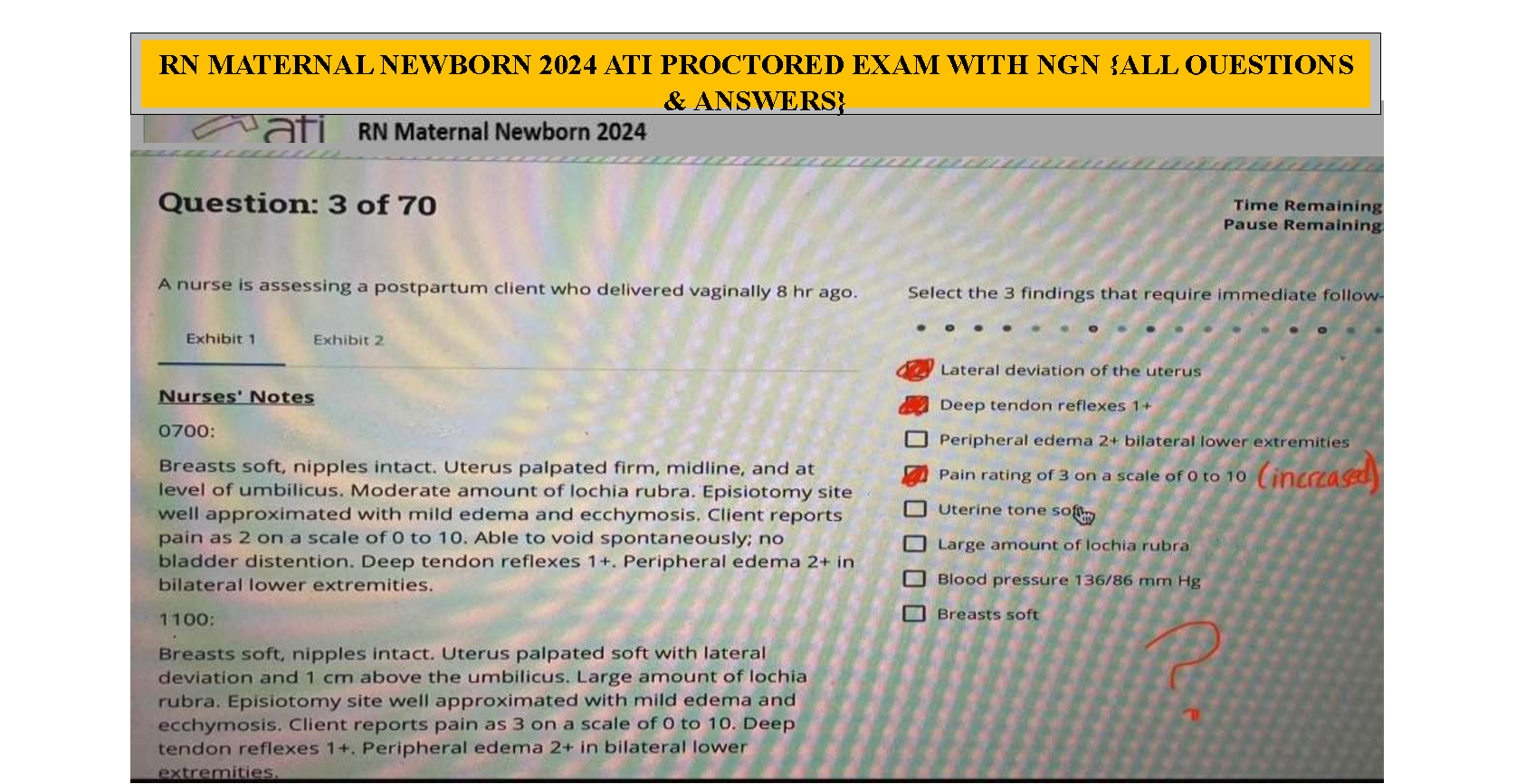 Prepare to excel on your ATI RN Maternal Newborn 2024 Proctored Exam with our premier test bank, fully equipped with the latest NGN-style questions and verified answers. This comprehensive resource covers every essential topic you'll face, from postpartum care to newborn assessments. Our detailed rationales will deepen your understanding and sharpen your clinical judgment. Designed for nursing students aiming for a first-attempt pass, this study guide is your ultimate tool to conquer the exam, avoid resits, and advance confidently in your nursing journey.