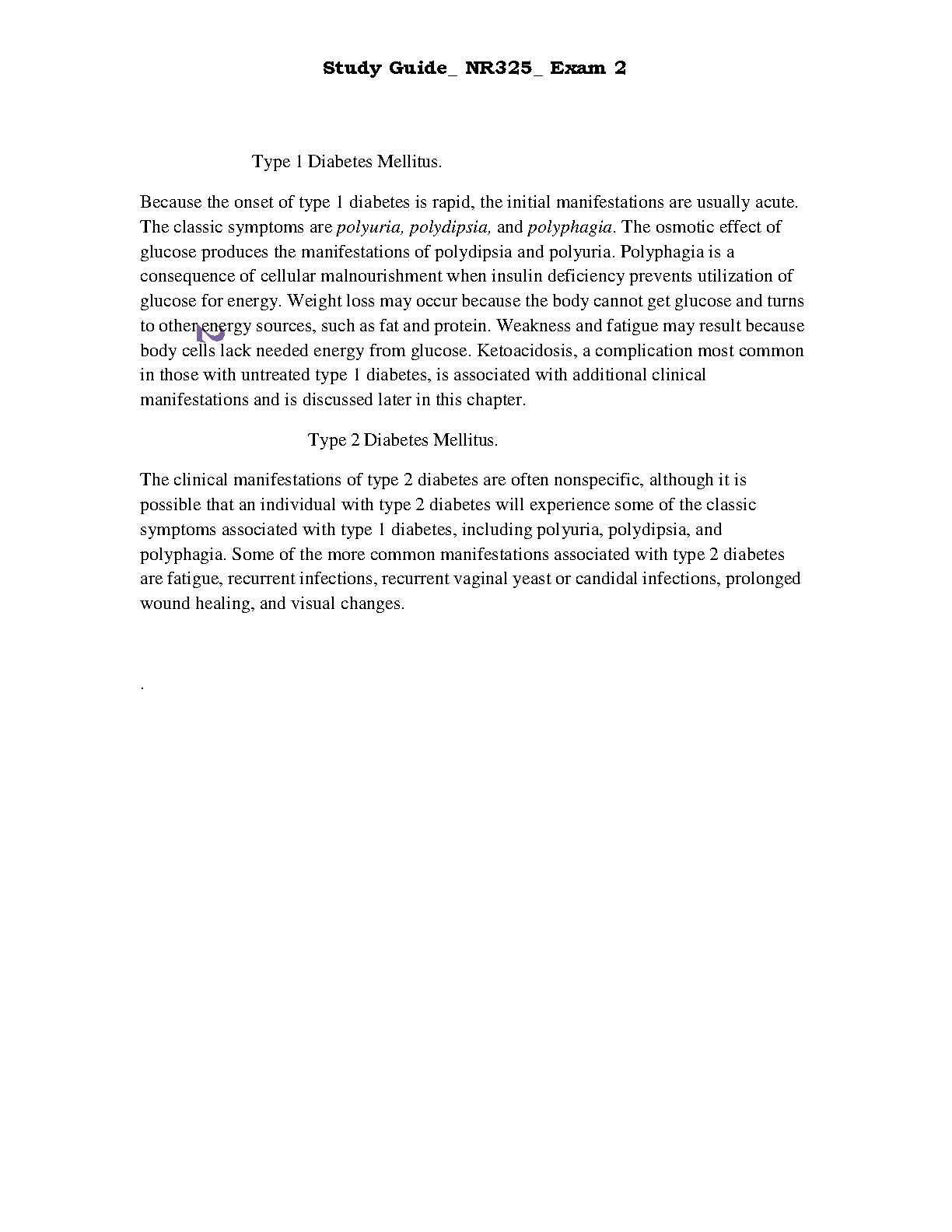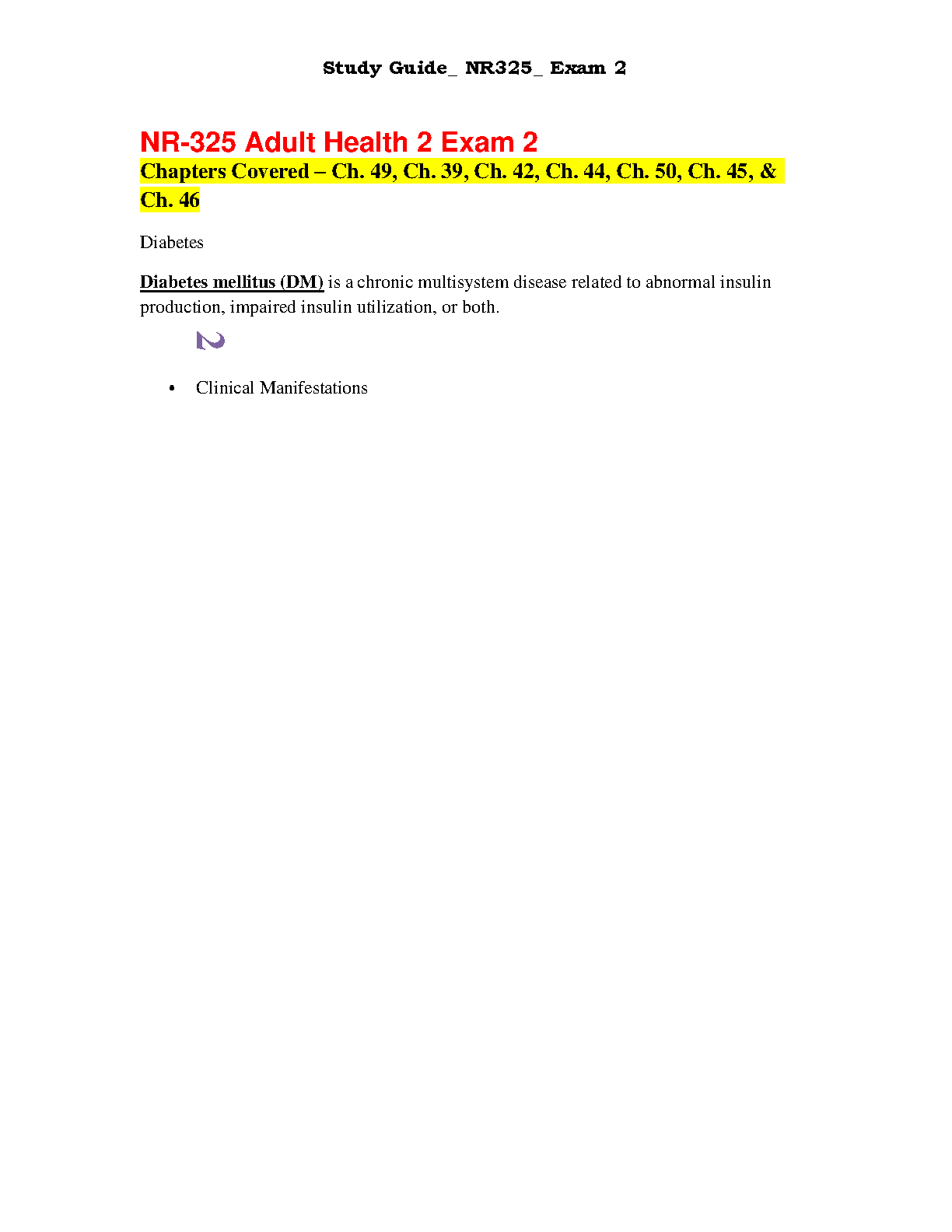 Master your NR-325 Adult Health 2 course with this comprehensive study guide for Exam 2, fully updated for the 2025/2026 academic year. This guide provides an in-depth review of essential content from Chapters 39, 42, 44, 45, 46, 49, & 50 of Lewis's Medical-Surgical Nursing, 11th Edition. Key topics covered include Diabetes Mellitus, musculoskeletal disorders, GI problems, and nutrition. Designed to streamline your study process, this resource is your key to understanding complex concepts and passing the exam on your first attempt, ensuring you avoid any resits.