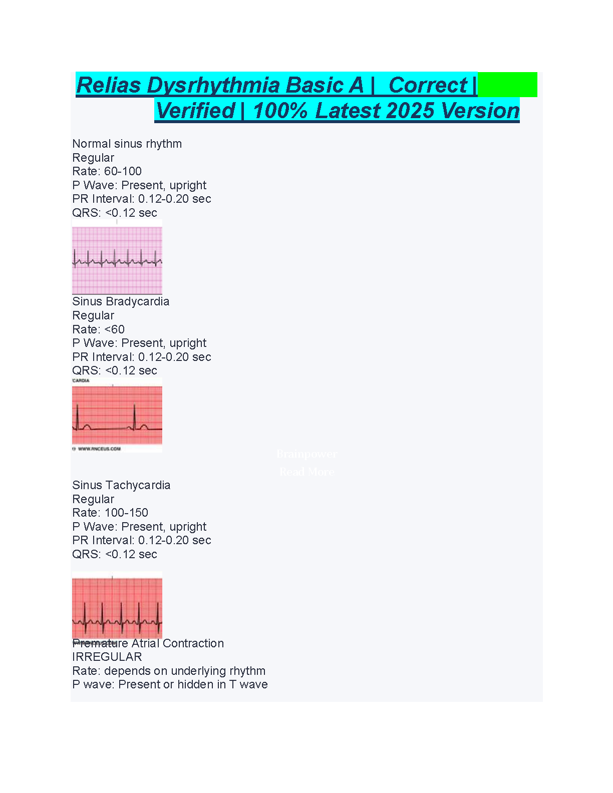 Ace your cardiac assessment with our definitive study guide for the Relias Dysrhythmia Basic A exam. Fully updated for the 2025/2026 curriculum, this guide is your key to mastering EKG interpretation. It features a complete collection of questions paired with 100% correct, verified answers, covering critical rhythms like Normal Sinus Rhythm, Sinus Bradycardia, and Sinus Tachycardia. This resource is expertly designed to provide you with the essential knowledge and confidence needed to pass your exam on the first attempt, eliminating the stress of resits. Get the grade you deserve with this top-tier study companion.