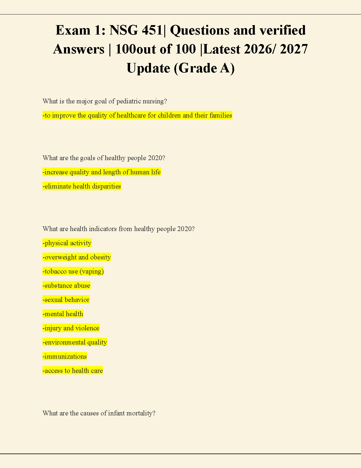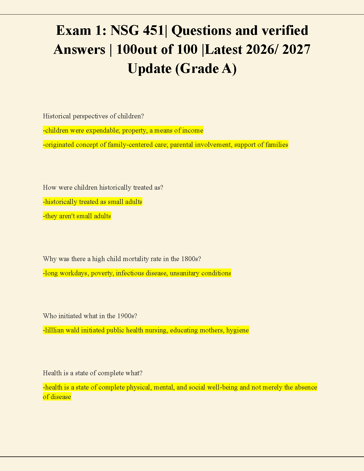 Instantly download the complete Test Bank for NSG 451 Exam 1. This essential study resource provides 100% correct and verified questions and answers, meticulously curated to help you achieve a Grade A. The content covers crucial topics in pediatric and child health nursing, aligning with major textbooks like Wong's Nursing Care of Infants and Children by Hockenberry & Wilson. Master complex concepts, understand historical perspectives, and walk into your exam with confidence. Secure your success and pass on the first try with this latest updated guide.