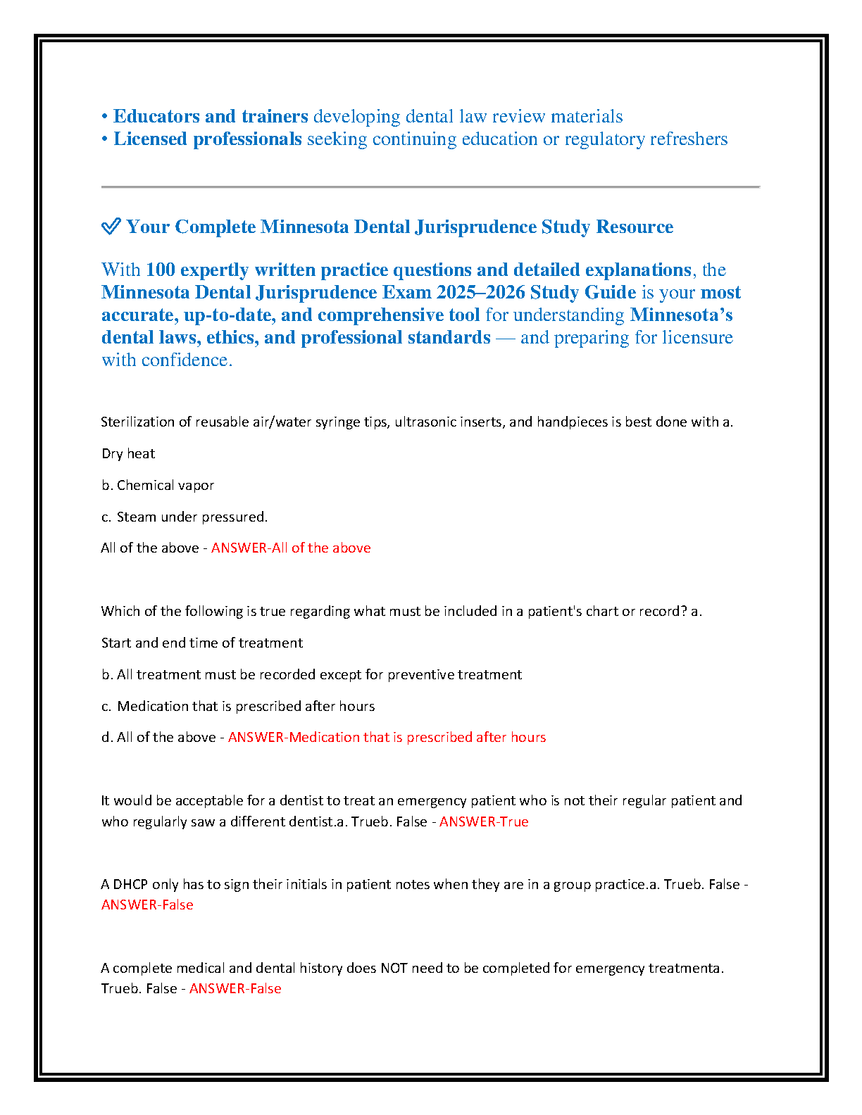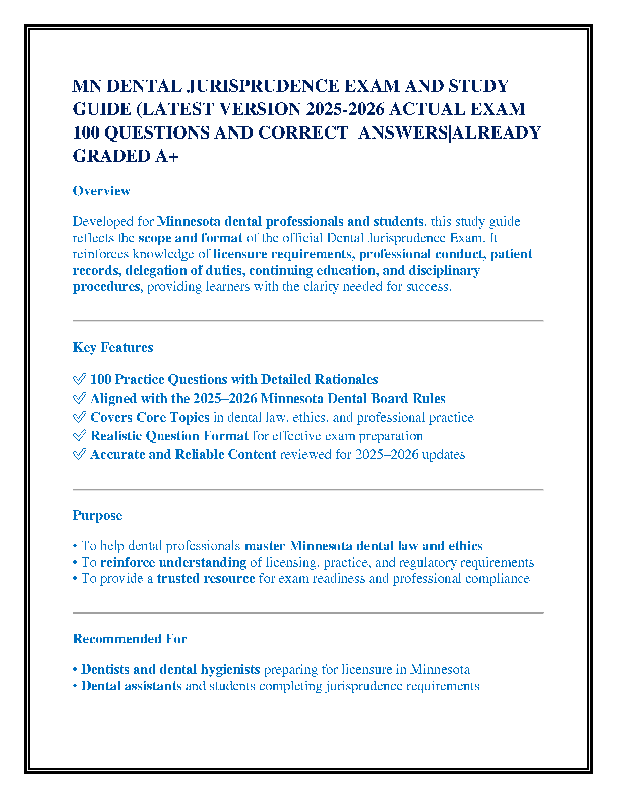 Ace your Minnesota Dental Jurisprudence Exam on the first try! This comprehensive 2025-2026 test bank is your ultimate study partner, packed with 100 meticulously crafted practice questions and detailed, correct answers. Master all essential topics including licensure requirements, professional ethics, patient record management, delegation of duties, and disciplinary actions, all fully aligned with the latest Minnesota Dental Board regulations. Designed for dentists, dental hygienists, and students, this A+ graded resource provides a realistic exam experience to ensure you walk into your test with confidence and pass with ease.