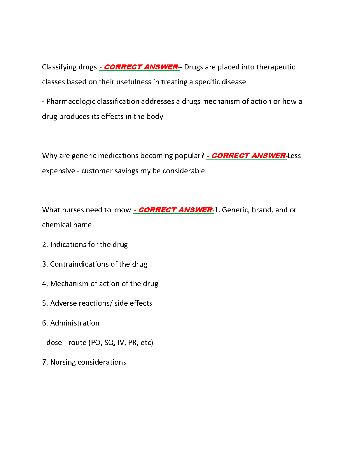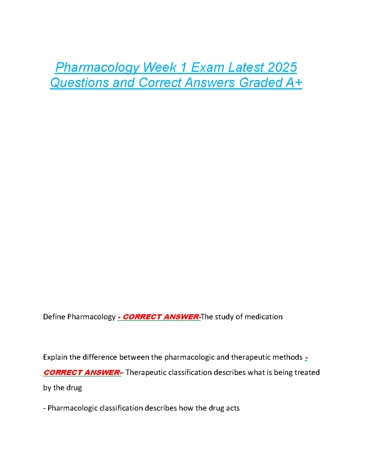 Ace your first pharmacology exam with our comprehensive test bank for Week 1, fully updated for the 2025/2026 academic year. This resource provides a complete set of exam-style questions along with verified, A+ graded correct answers. It covers fundamental topics like the definition of pharmacology and the distinction between pharmacologic and therapeutic classifications. This study guide is expertly designed to help you grasp key concepts quickly, boost your confidence, and pass your exam on the first attempt. Stop stressing and start studying smarter with our proven-effective resource.