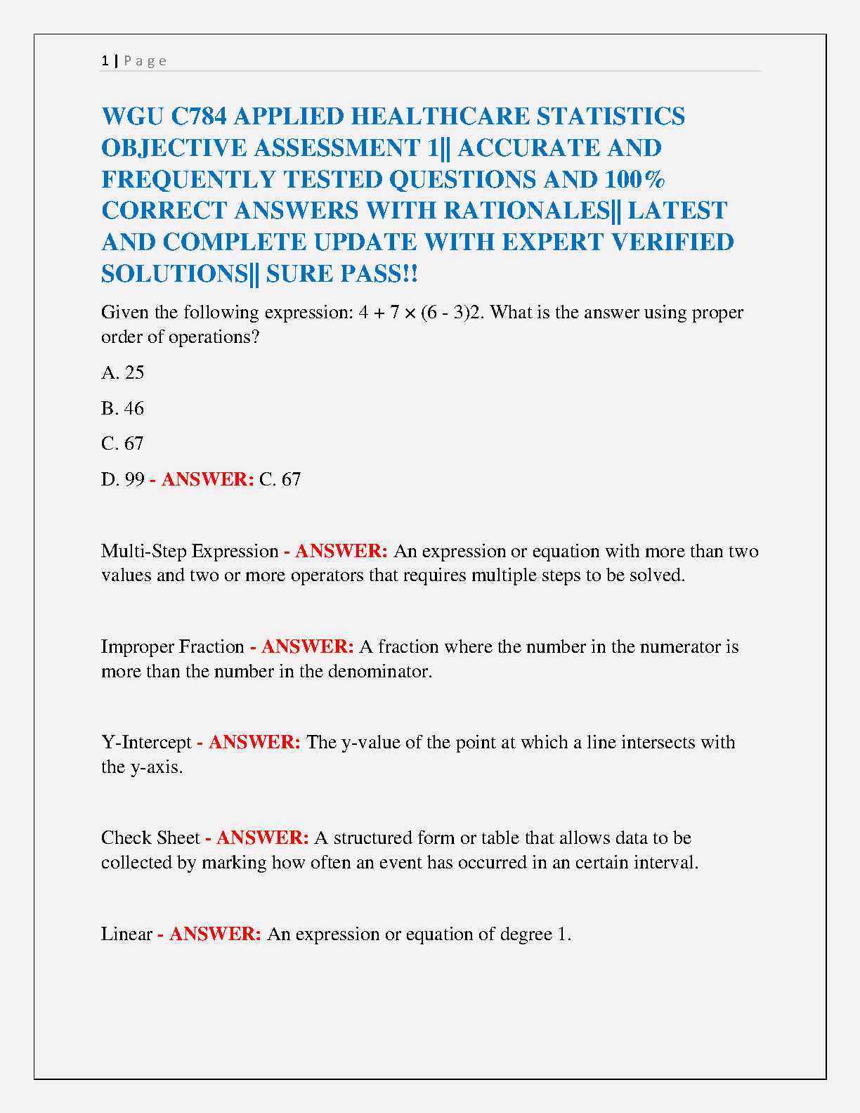 Unlock success in your WGU C784 Applied Healthcare Statistics course with our premier Objective Assessment 1 Test Bank. This comprehensive resource, fully updated for the 2025/2026 academic year, is meticulously designed to help you pass on your very first attempt. Inside, you'll find a complete collection of frequently tested questions, 100% correct and expert-verified answers, and clear rationales to deepen your understanding. Stop worrying about resits and confidently master the material needed to ace your exam. Get the ultimate study partner for WGU C784 today!
