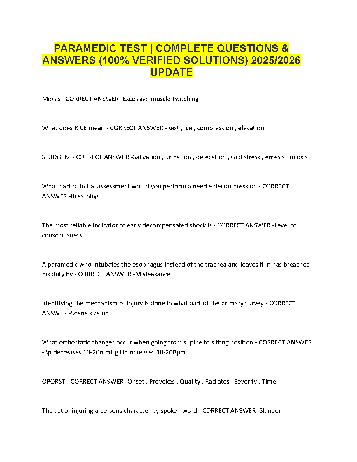 Struggling with your paramedic studies? Get ahead with our latest 2025/2026 Paramedic Test Bank. This comprehensive resource is packed with a complete set of exam questions and 100% verified, correct answers. Master crucial topics such as patient assessment (RICE, OPQRST), emergency procedures, shock management, and legal responsibilities. Our detailed solutions are designed to provide a deep understanding of the material, ensuring you're fully prepared to ace your exam on the first try. Say goodbye to exam anxiety and resits – download this essential study guide today and fast-track your path to becoming a certified paramedic!