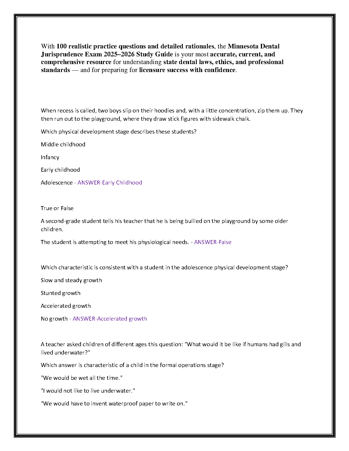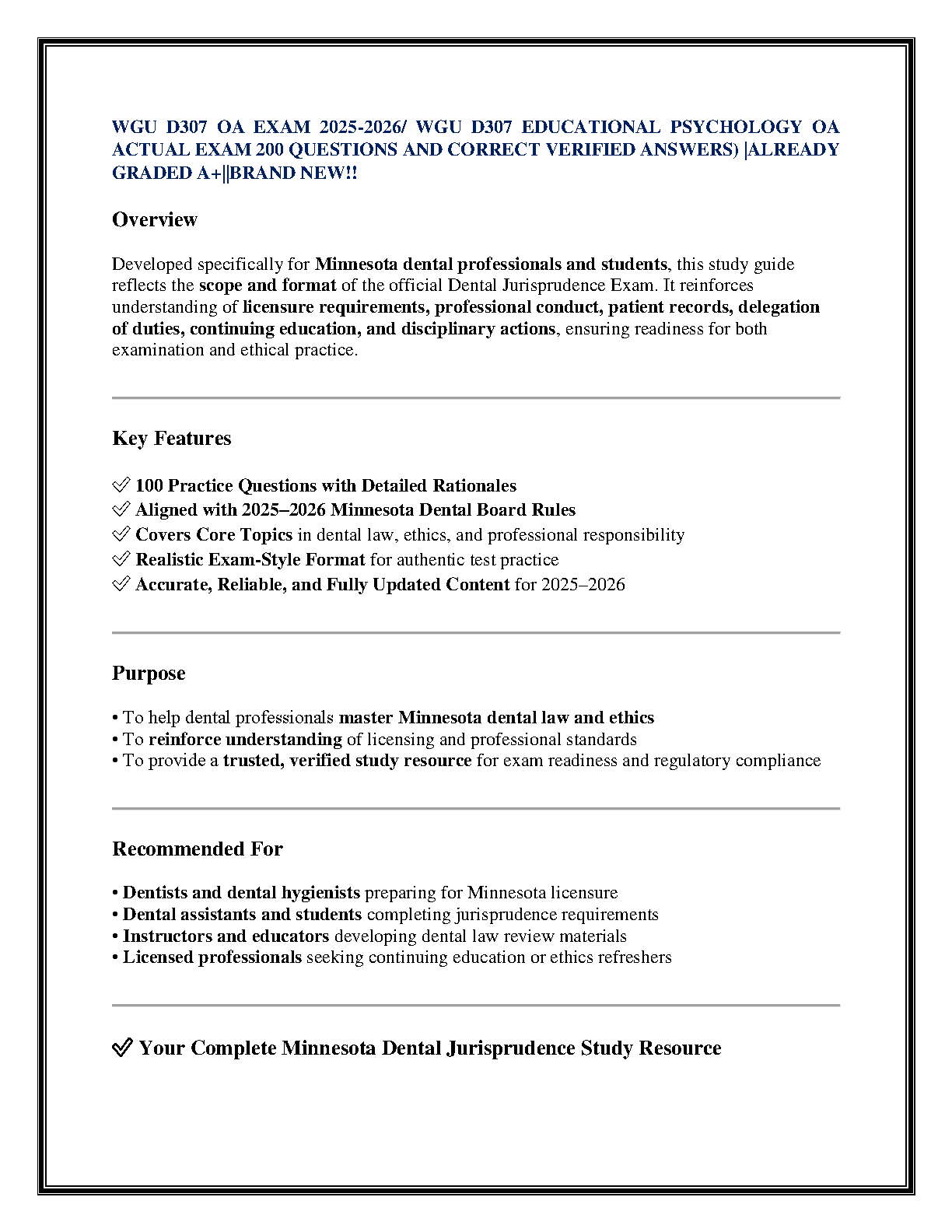 Master the Minnesota Dental Jurisprudence Exam on your first try with our comprehensive 2025-2026 study guide. This resource is expertly designed for dentists, dental hygienists, and students, providing over 100 realistic practice questions with detailed, verified answers and rationales. Aligned with the latest Minnesota Dental Board rules for 2025-2026, this guide covers all critical topics, including dental law, ethics, professional responsibility, licensure requirements, and patient record management. The authentic exam-style format ensures you are fully prepared and confident for test day. Get the trusted, up-to-date content you need to achieve an A+ and secure your licensure without resits.