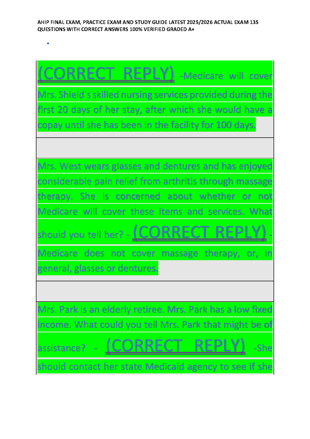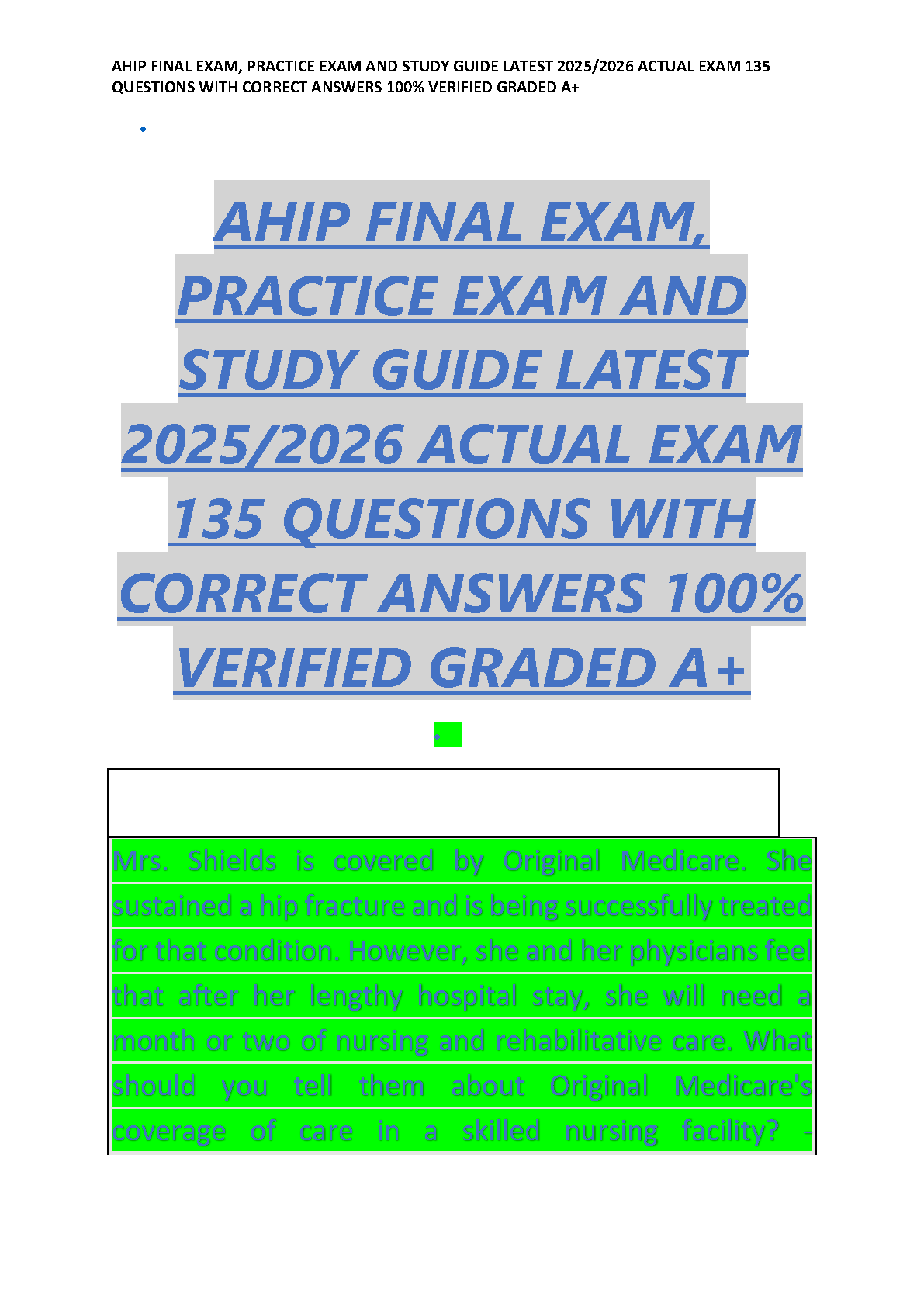 Ace your America's Health Insurance Plans (AHIP) certification with our latest 2025/2026 Final Exam Study Guide. This comprehensive resource is expertly designed to help you pass on your very first attempt. Inside, you'll find 135 meticulously crafted questions, each with a 100% verified and correct answer, mirroring the actual exam format. Covering all crucial topics, including complex scenarios like Medicare coverage for skilled nursing facilities, this guide ensures you are fully prepared. Don't risk a resit—master the material, build your confidence, and achieve an A+ grade with our trusted practice exam and study guide.